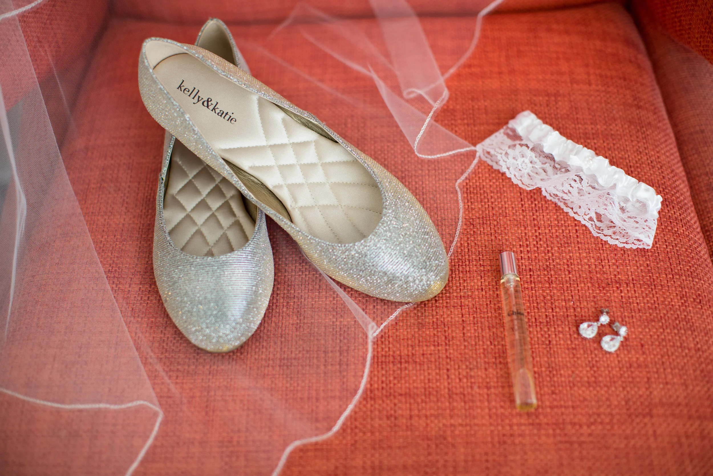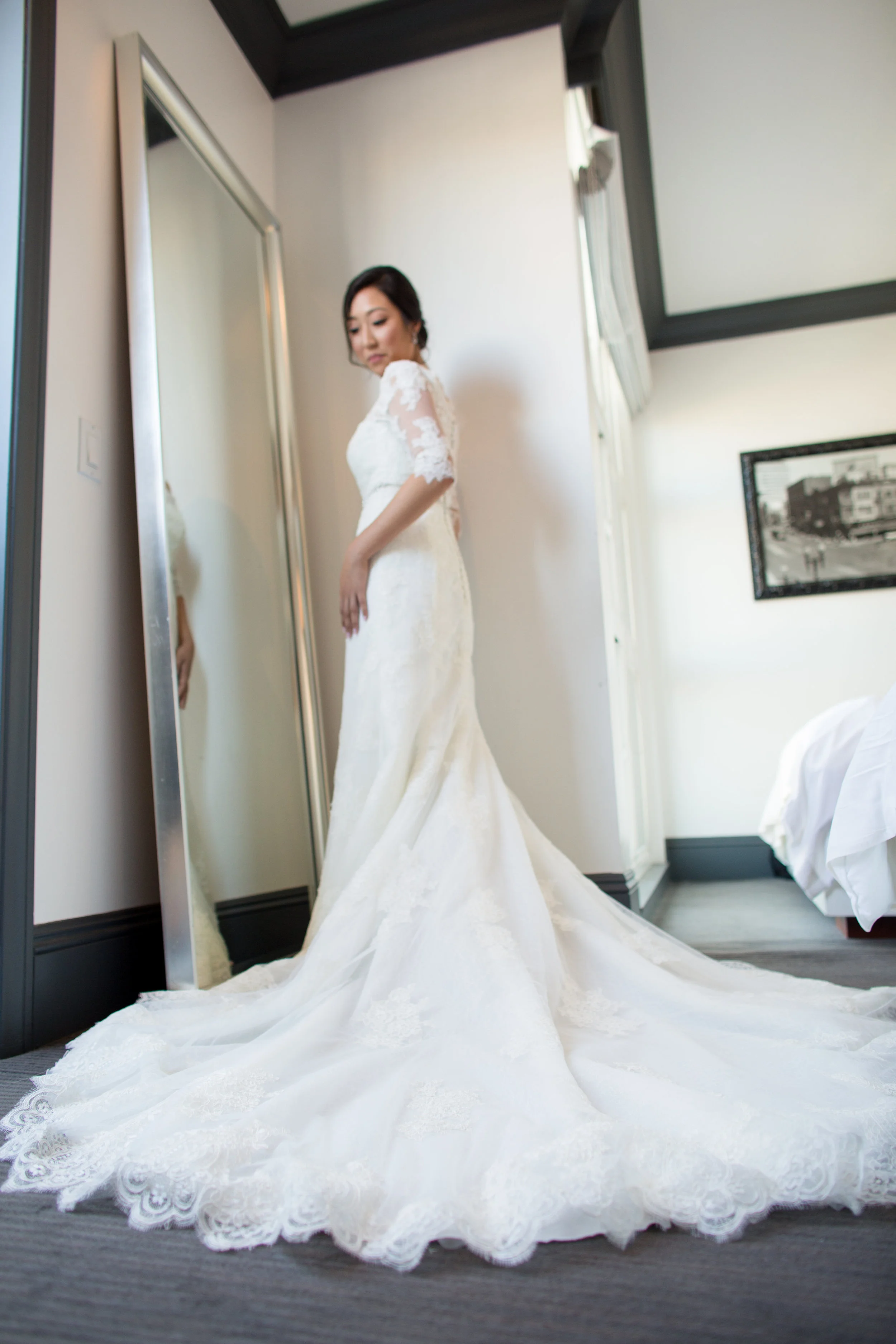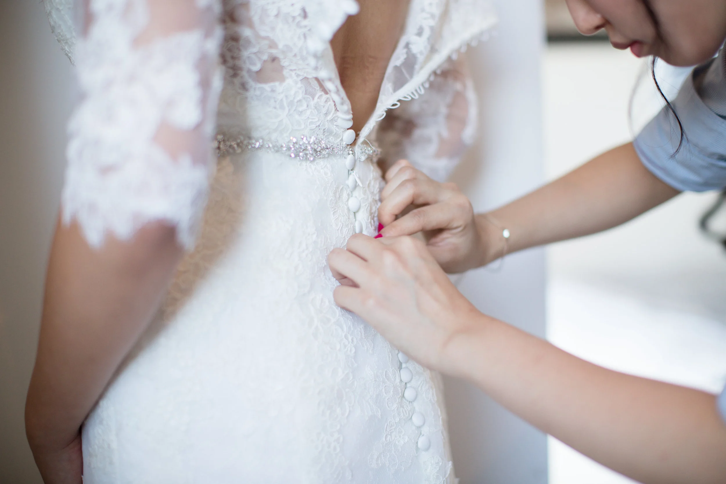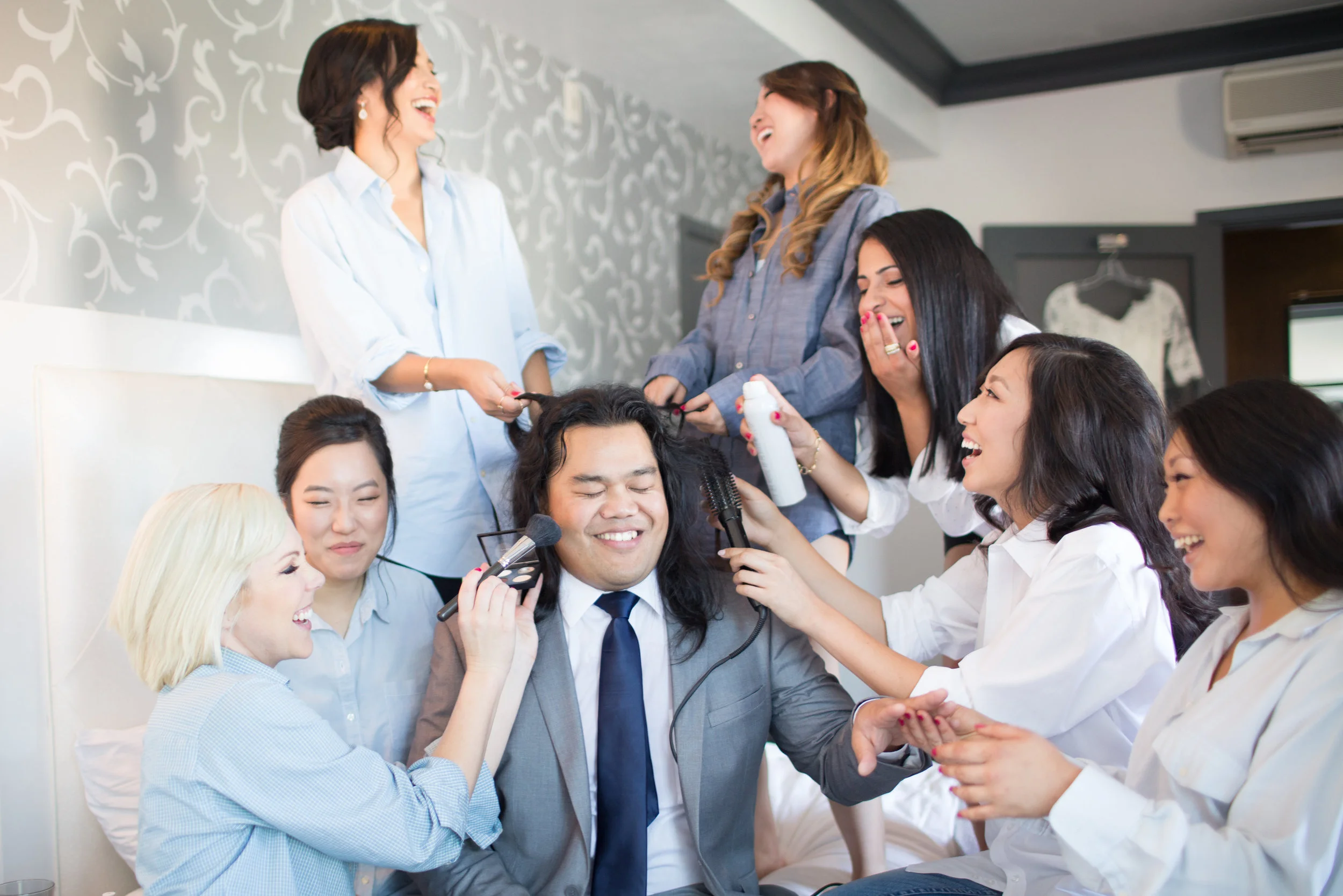 The day started with the ladies getting ready together at La Pensione Hotel. The bridesmaids spent the morning getting their hair and make-up done, checking out the pretty necklace they were gifted by Angie, and even pitched in to groom one of the groomsmen! I love the way they coordinated blue dress shirts to get ready in so that their hair and make-up would stay nice and neat when they changed to their dresses later on. Angie looks so elegant and absolutely gorgeous in her off-the-shoulder lace sheath wedding dress!