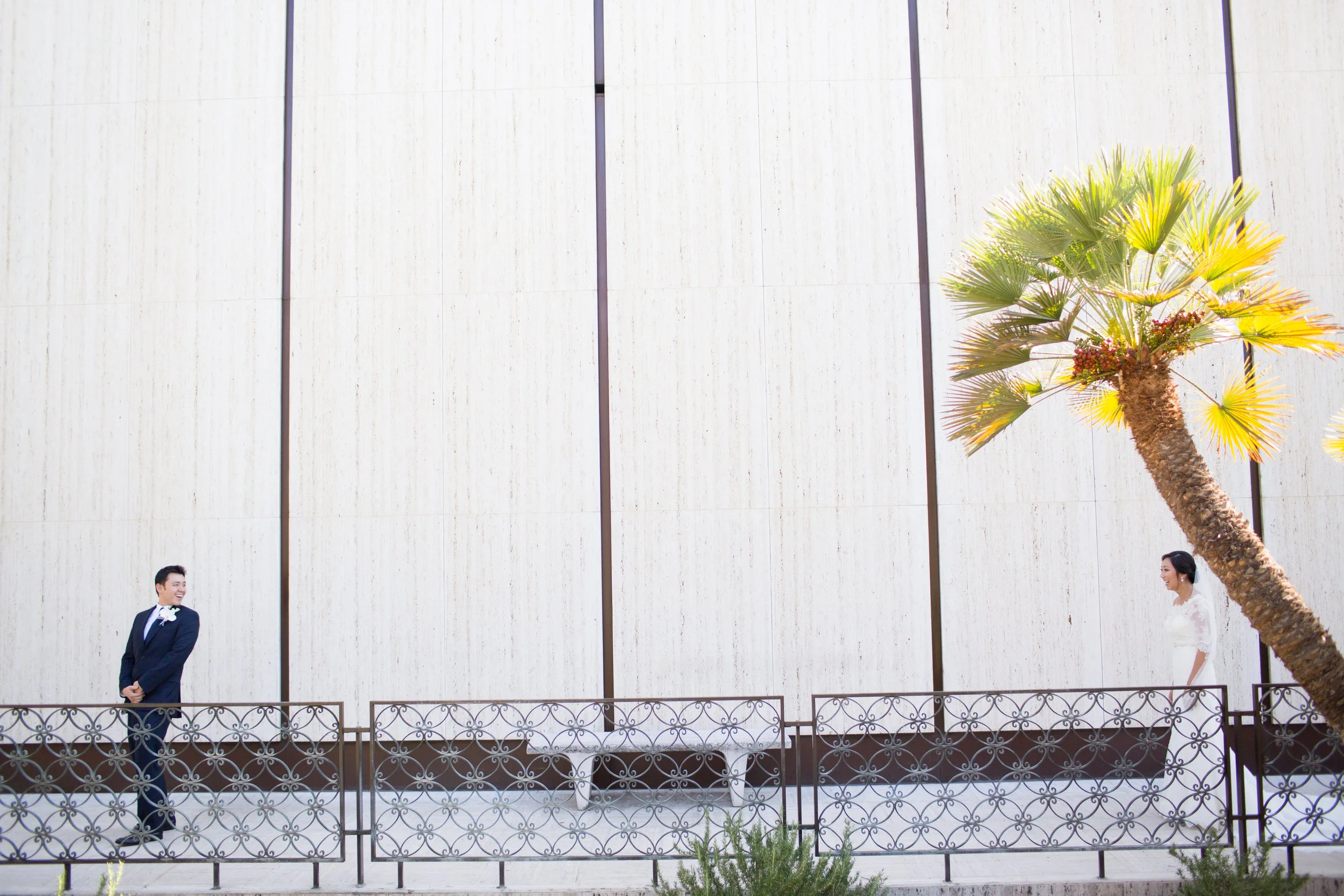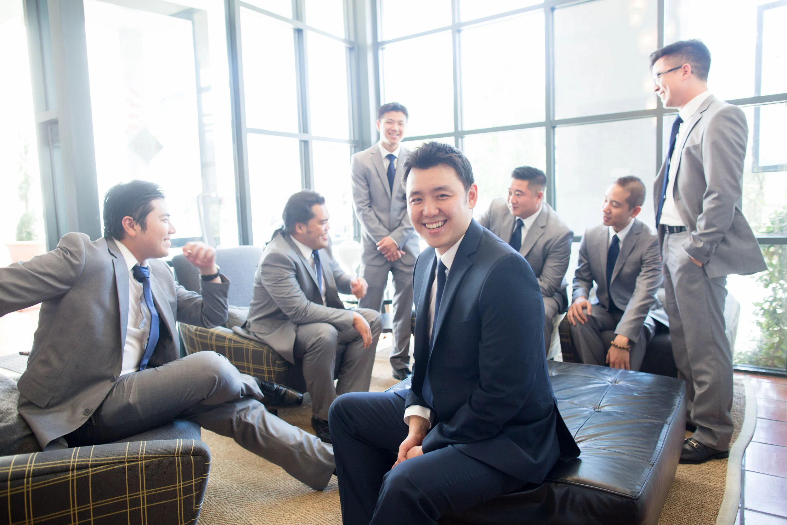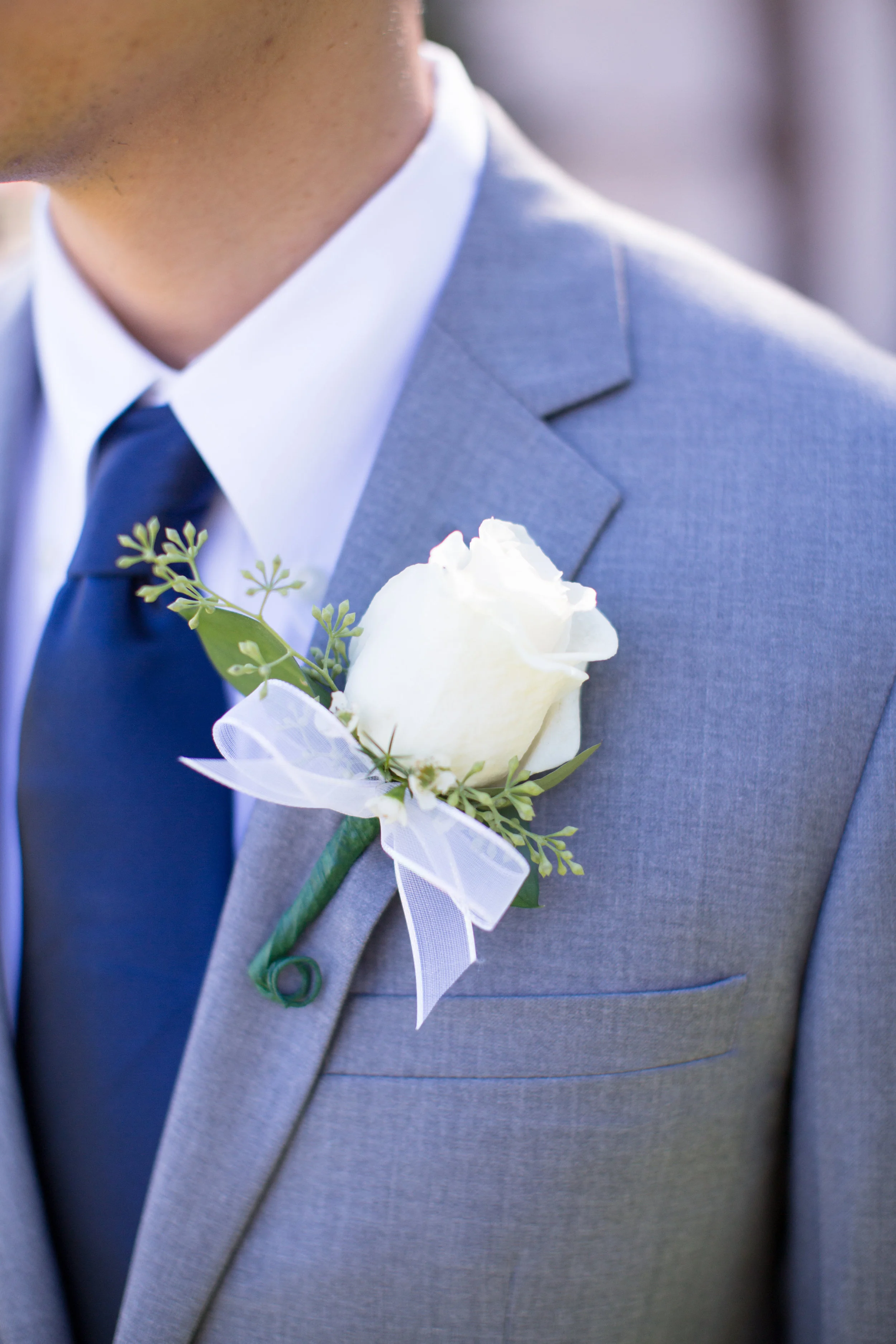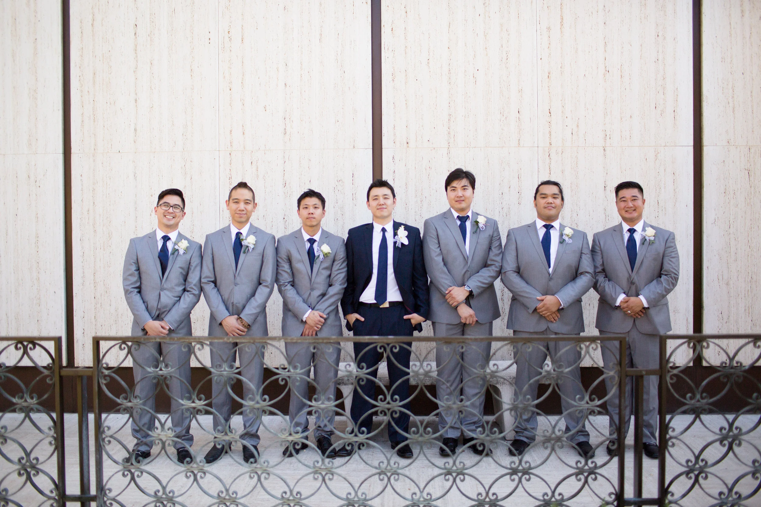 John and his groomsmen look handsome in these clean grey suits. Their ties match well with John's navy blue suit. The look is finished off with a single large white rose boutonnière. These men are ready to go! The group relied on Uber to get from La Pensione Hotel to Balboa Park. Enjoy these cute photos from their First Look below!