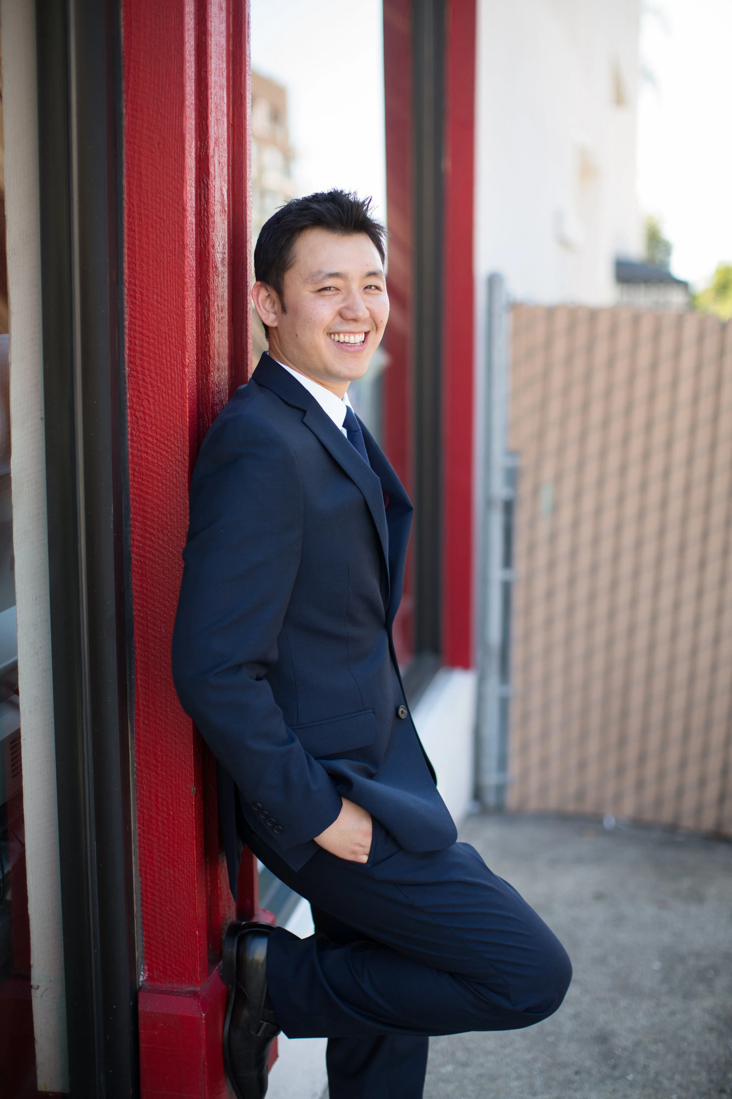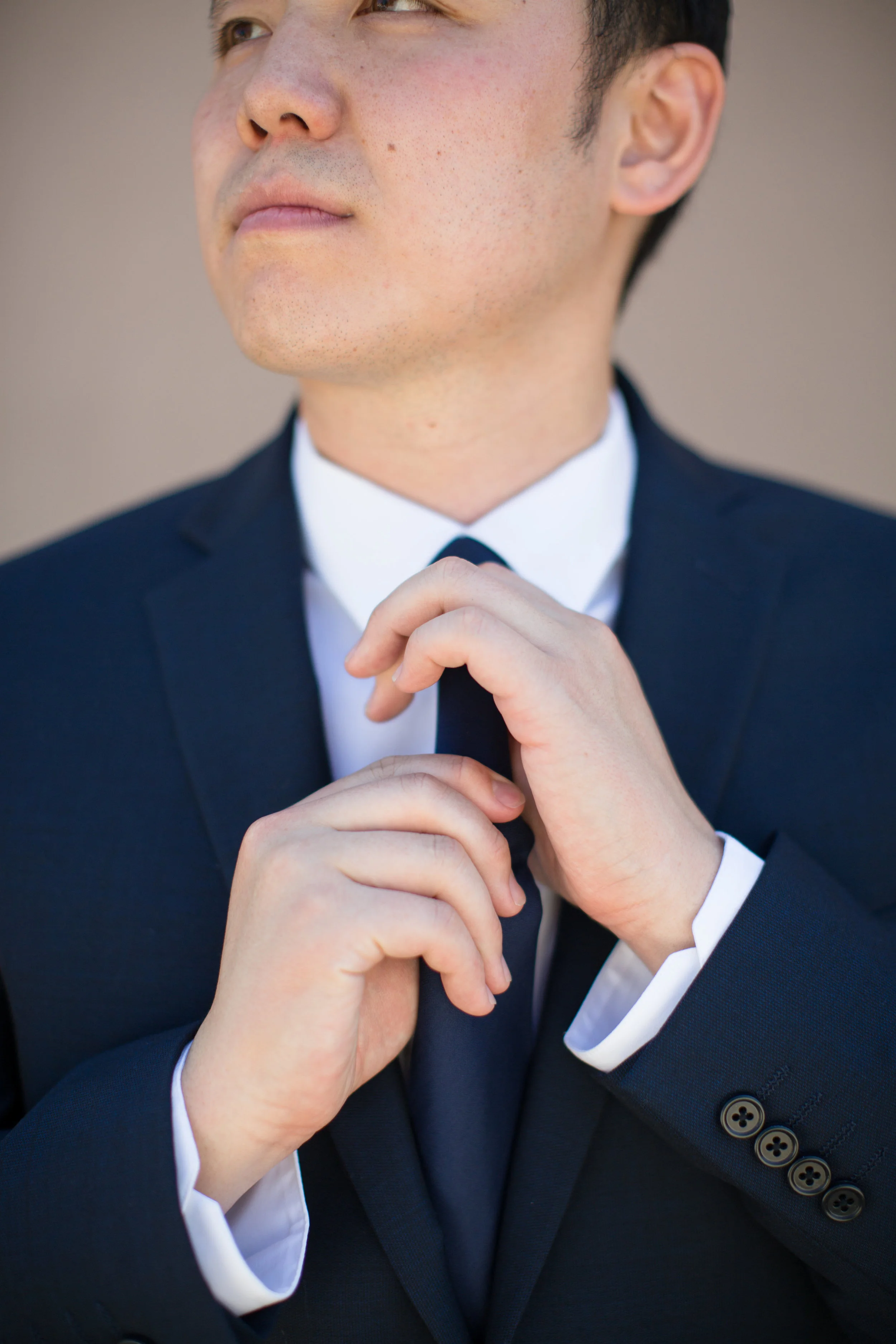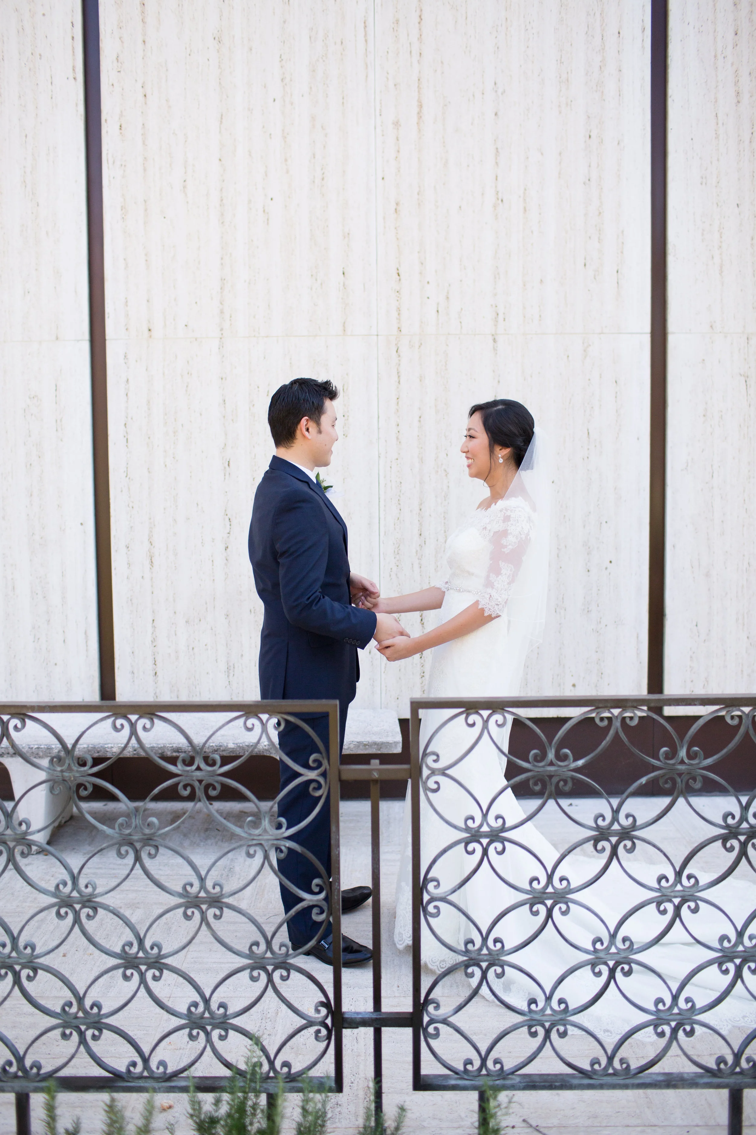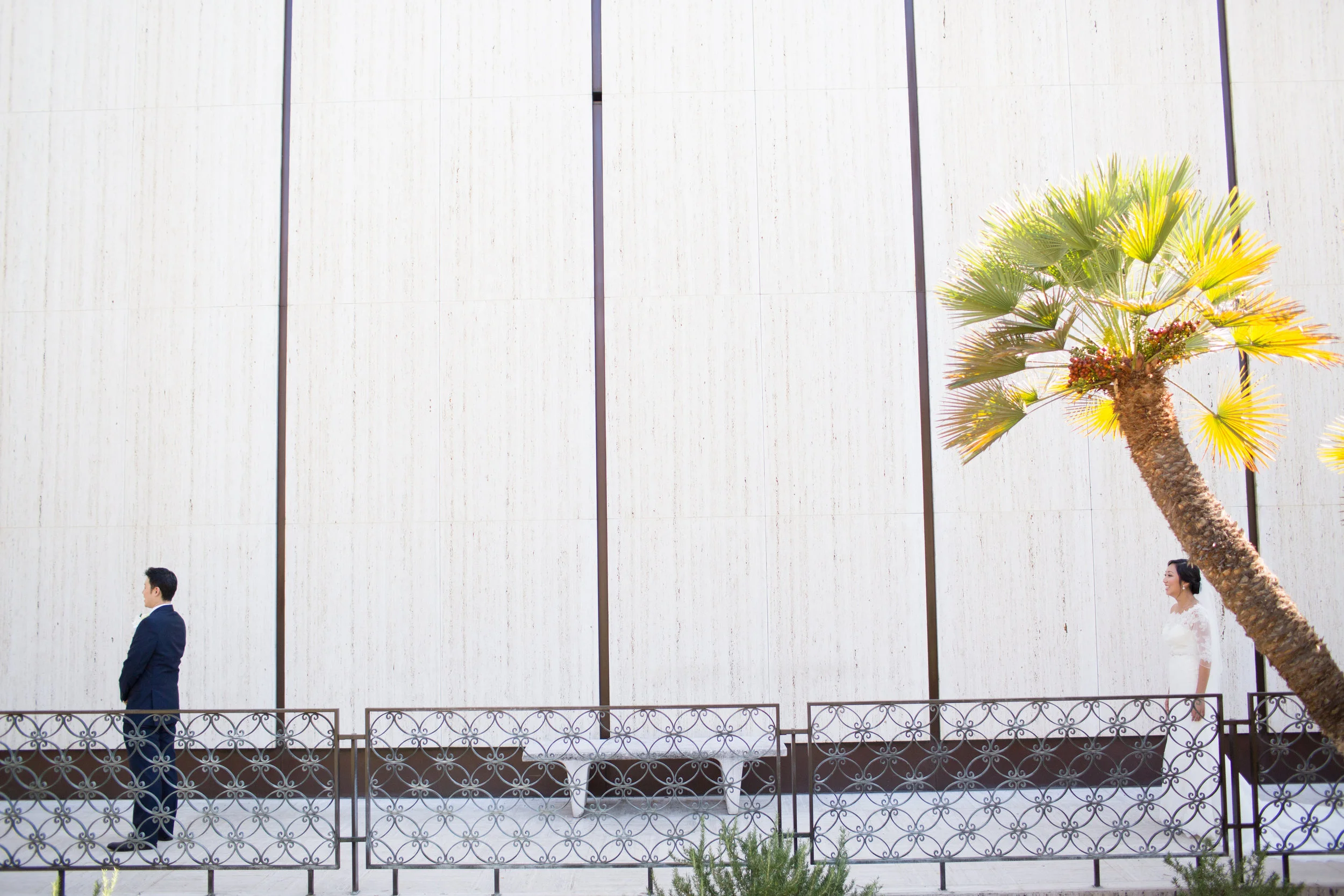 John and his groomsmen look handsome in these clean grey suits. Their ties match well with John's navy blue suit. The look is finished off with a single large white rose boutonnière. These men are ready to go! The group relied on Uber to get from La Pensione Hotel to Balboa Park. Enjoy these cute photos from their First Look below!