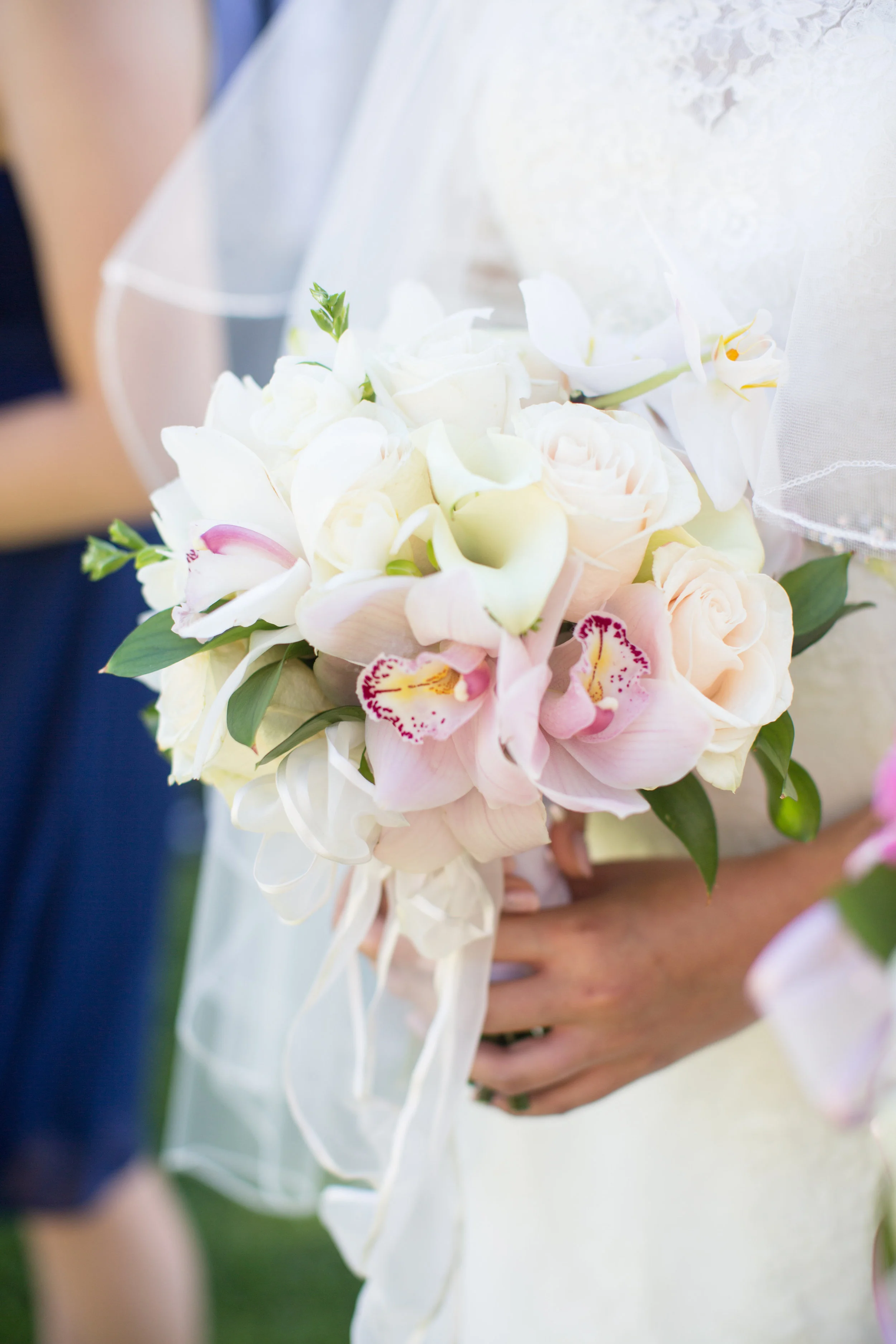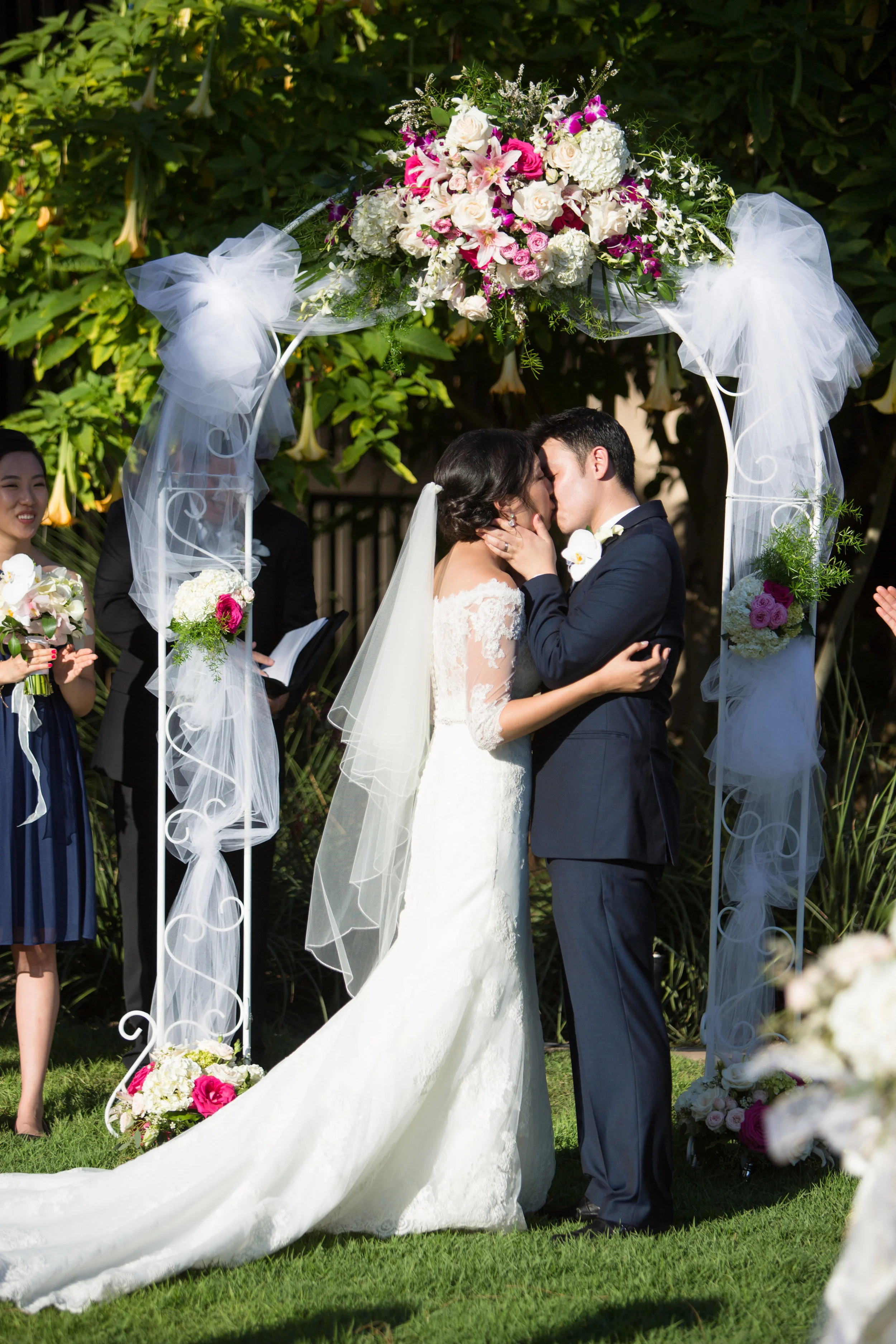 The ceremony was held on the Botanical Garden Lawns at Balboa Park. The Botanical Building was an iconic San Diego backdrop for the wedding. The arch and aisleways were decorated with floral arrangements featuring white hydrangeas, pink lilies, white and pink roses, and some blush orchids.