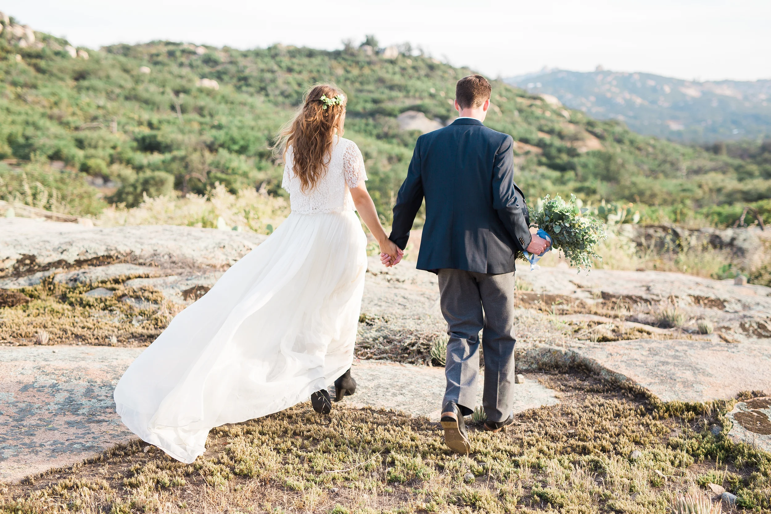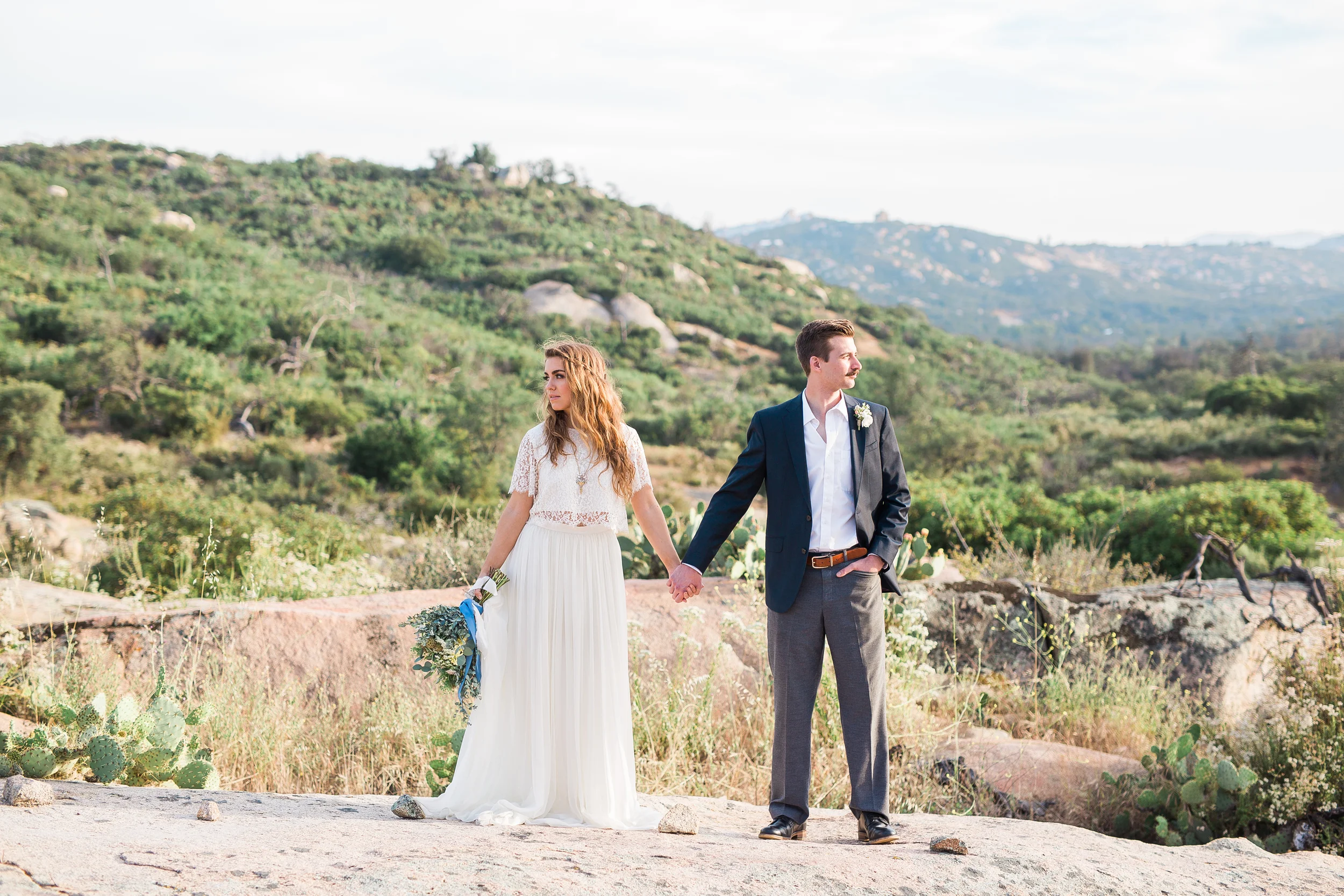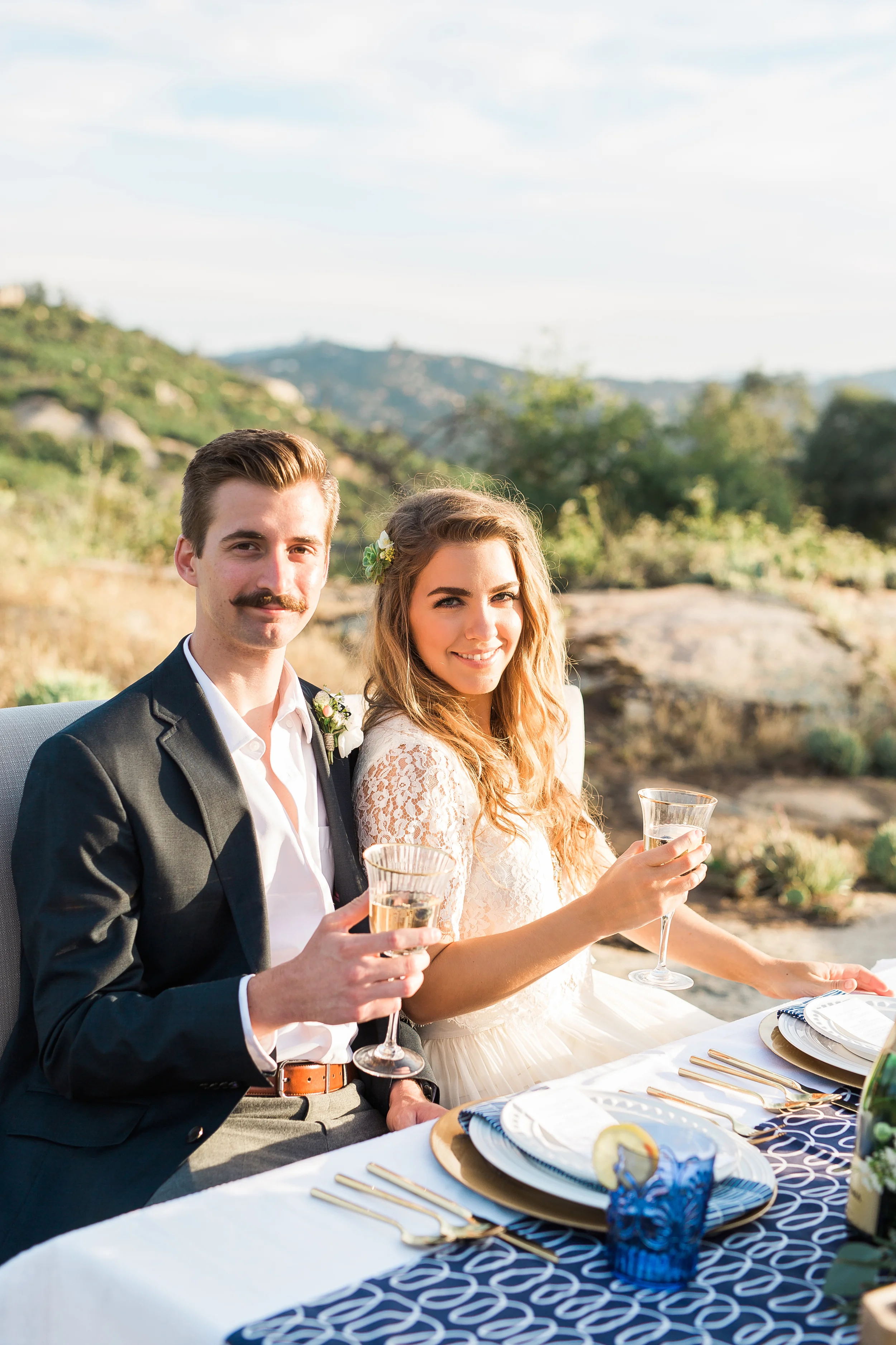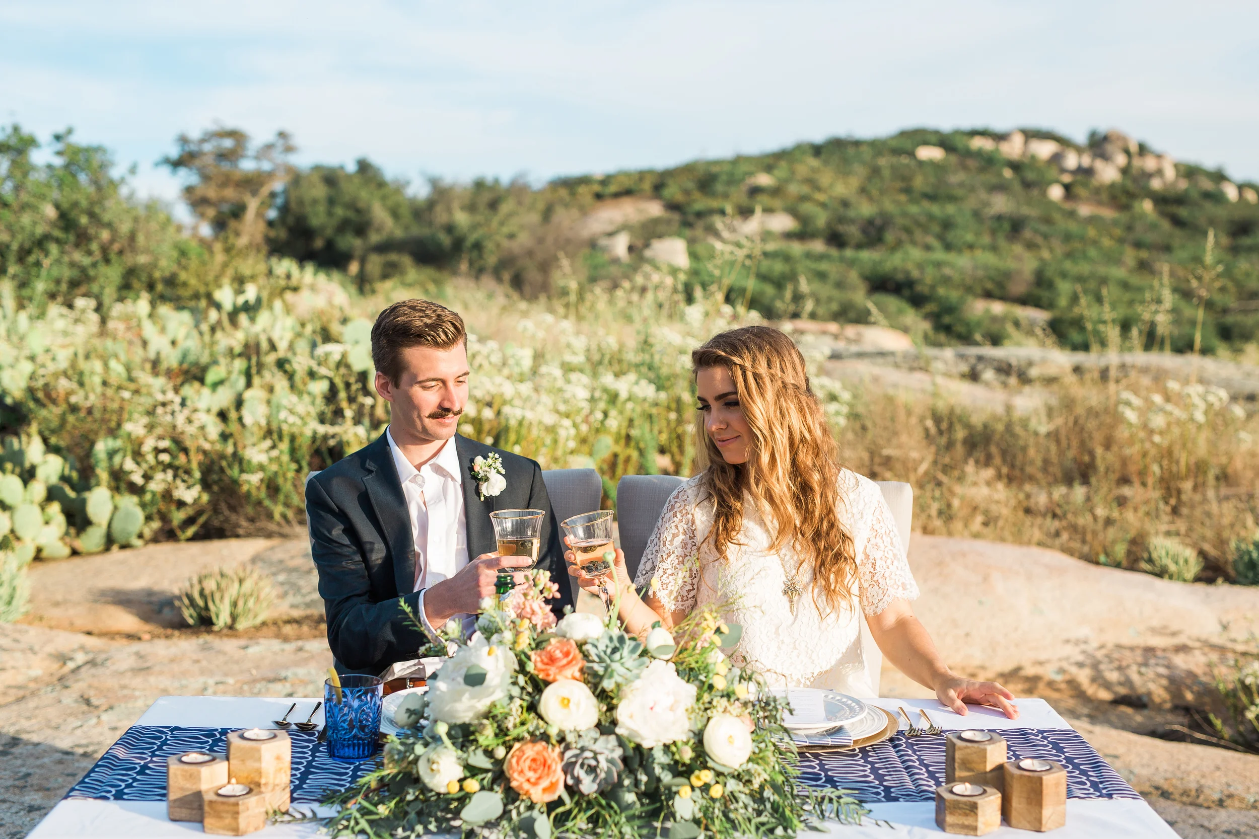 Nestled in the rolling hills of Jamul, the Bradford Ranch is a spacious venue with many different gorgeous vantage points. Our inspiration comes from the sunshine and beautiful, natural landscape of southern California. With the sun dipping lower in the sky, stunning sunbeams shine through the tree branches onto glass ornaments filled with succulents. The landscape consists of large boulders, cactus, succulents, and little yellow wildflowers.