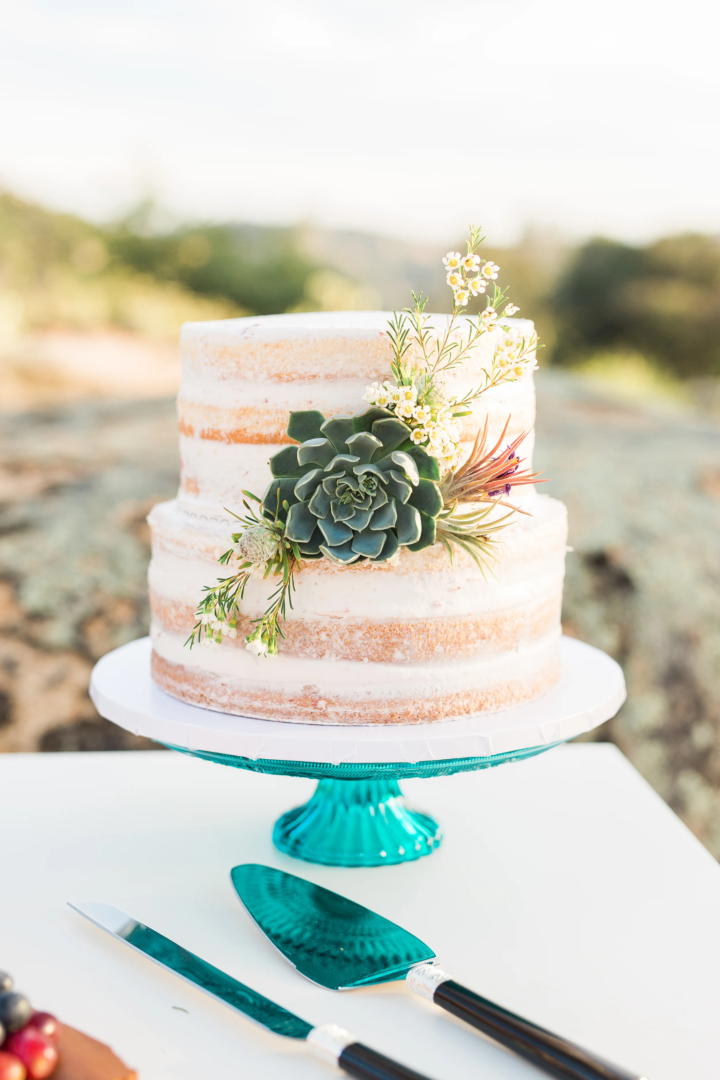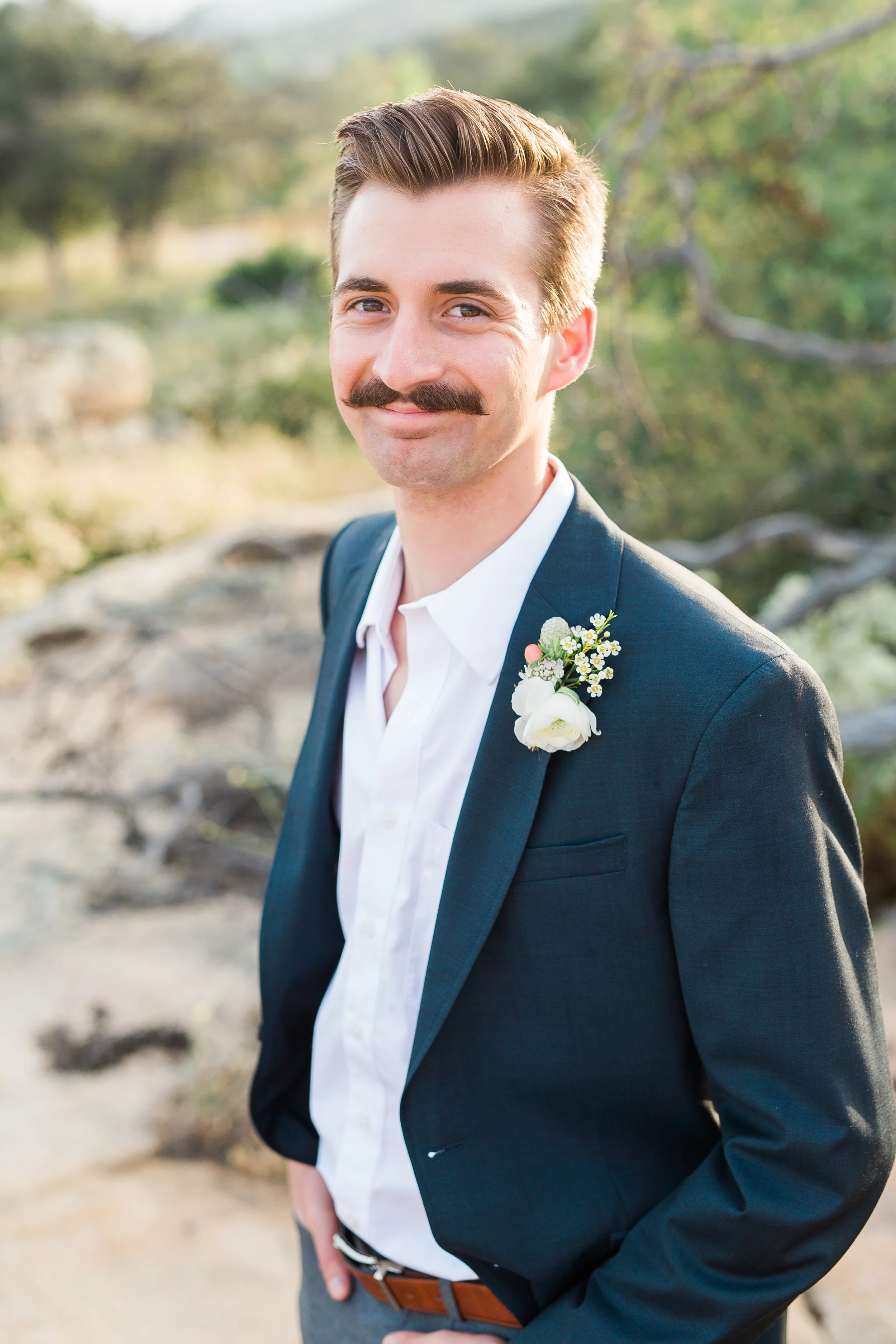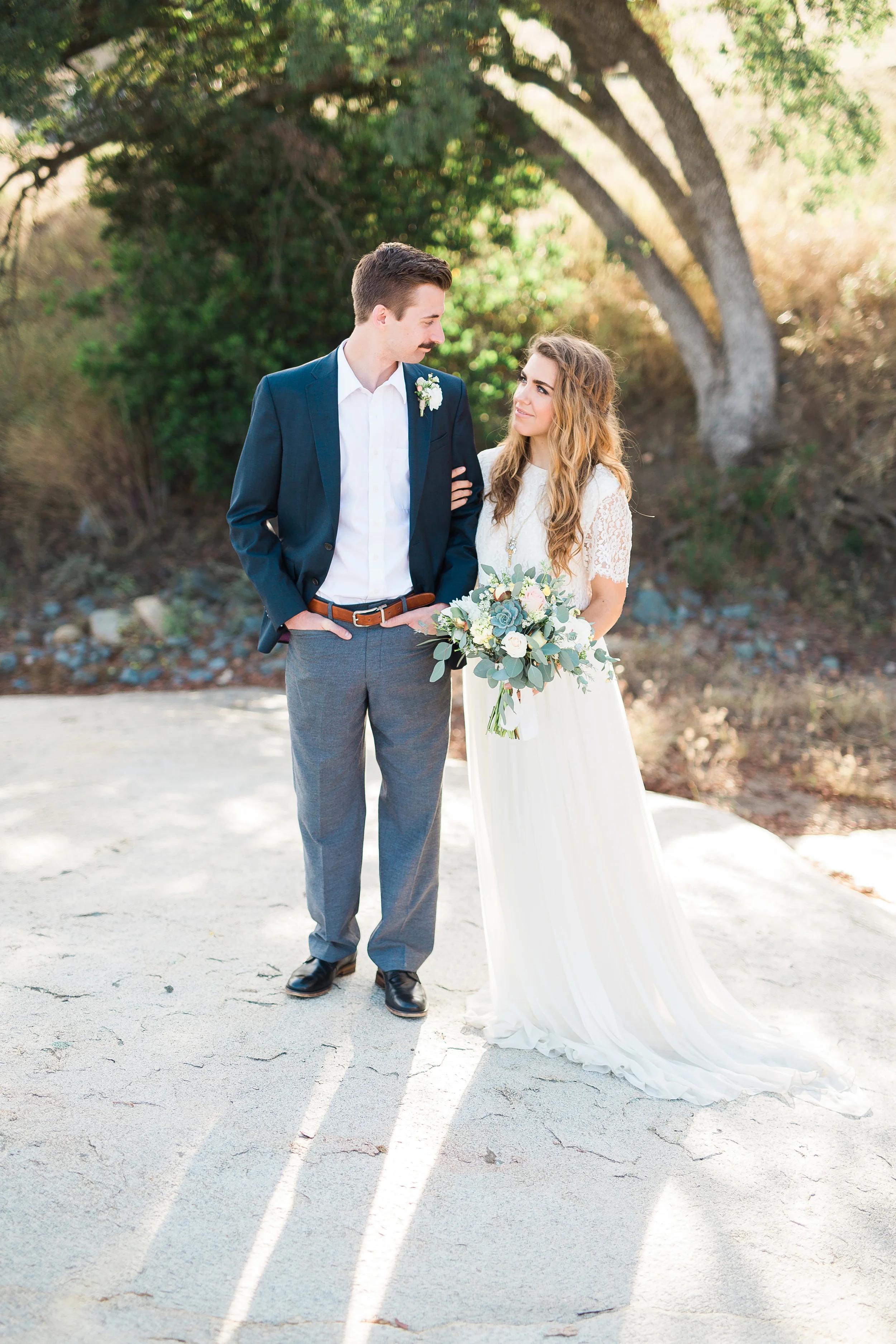 Nestled in the rolling hills of Jamul, the Bradford Ranch is a spacious venue with many different gorgeous vantage points. Our inspiration comes from the sunshine and beautiful, natural landscape of southern California. With the sun dipping lower in the sky, stunning sunbeams shine through the tree branches onto glass ornaments filled with succulents. The landscape consists of large boulders, cactus, succulents, and little yellow wildflowers.