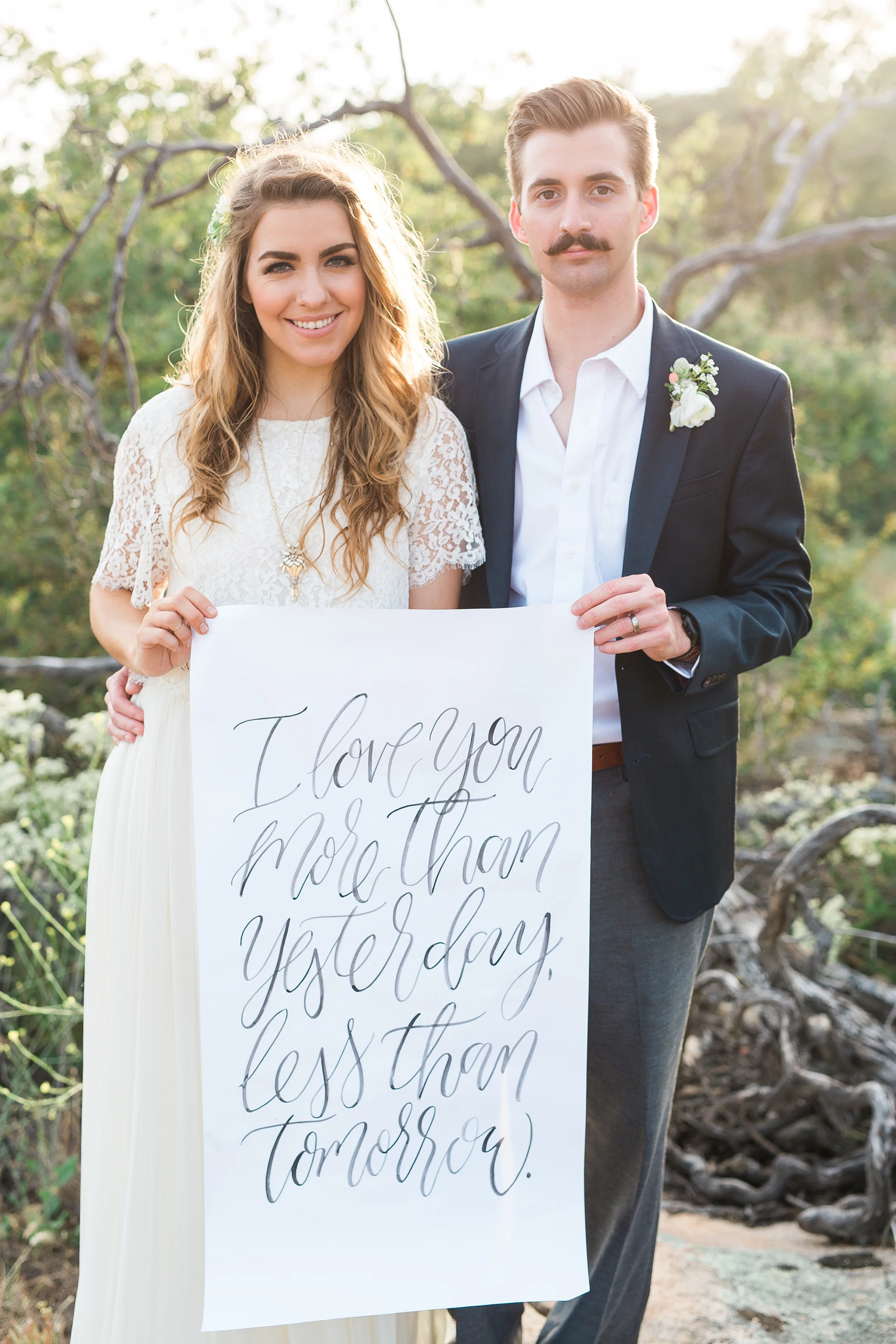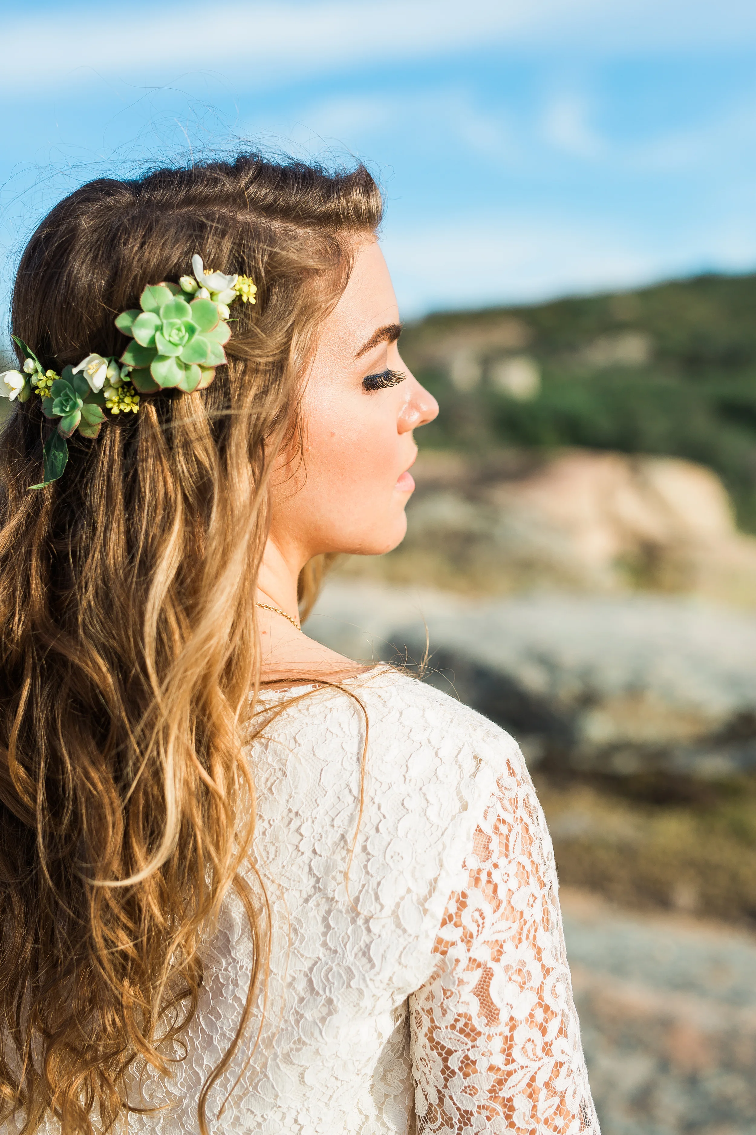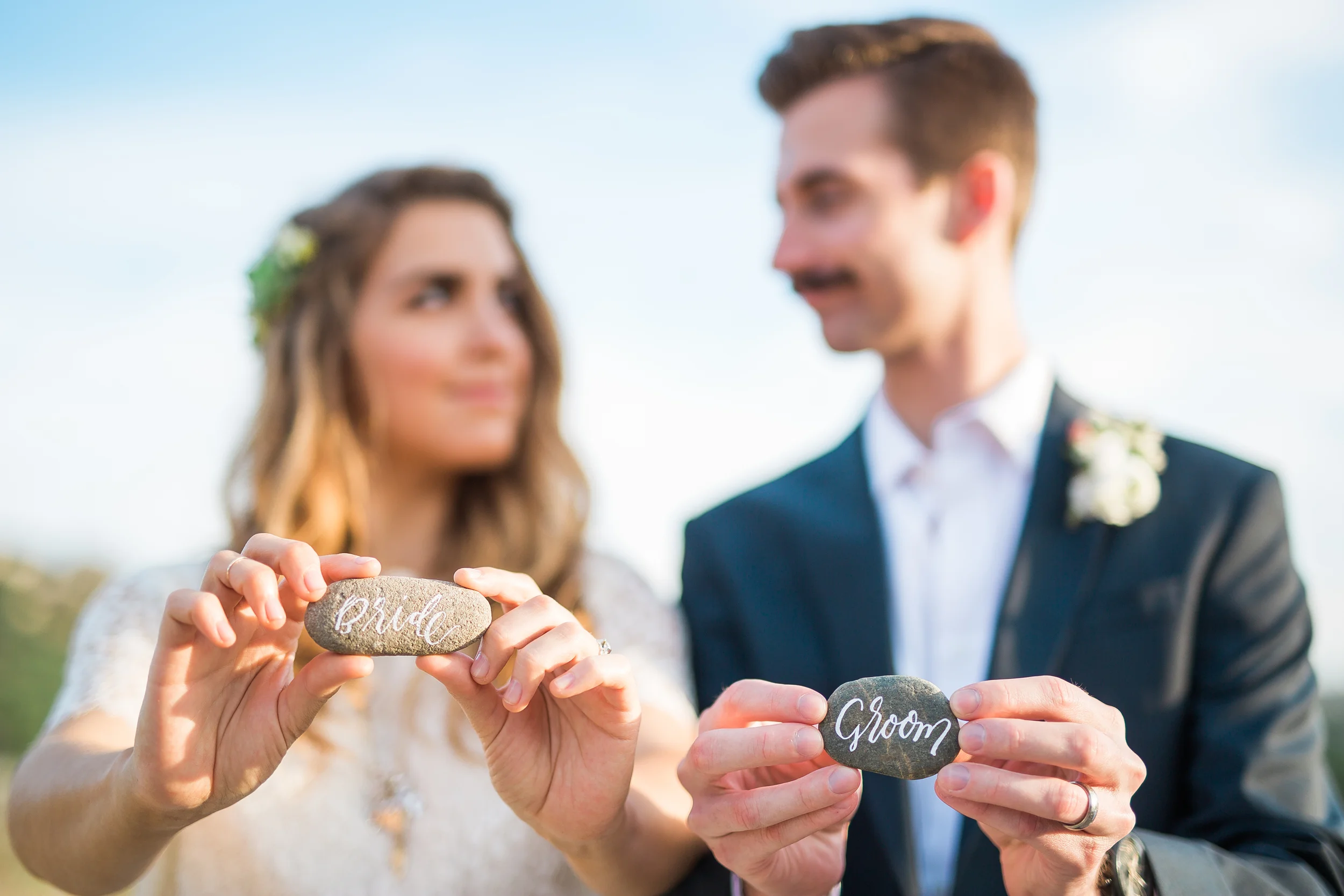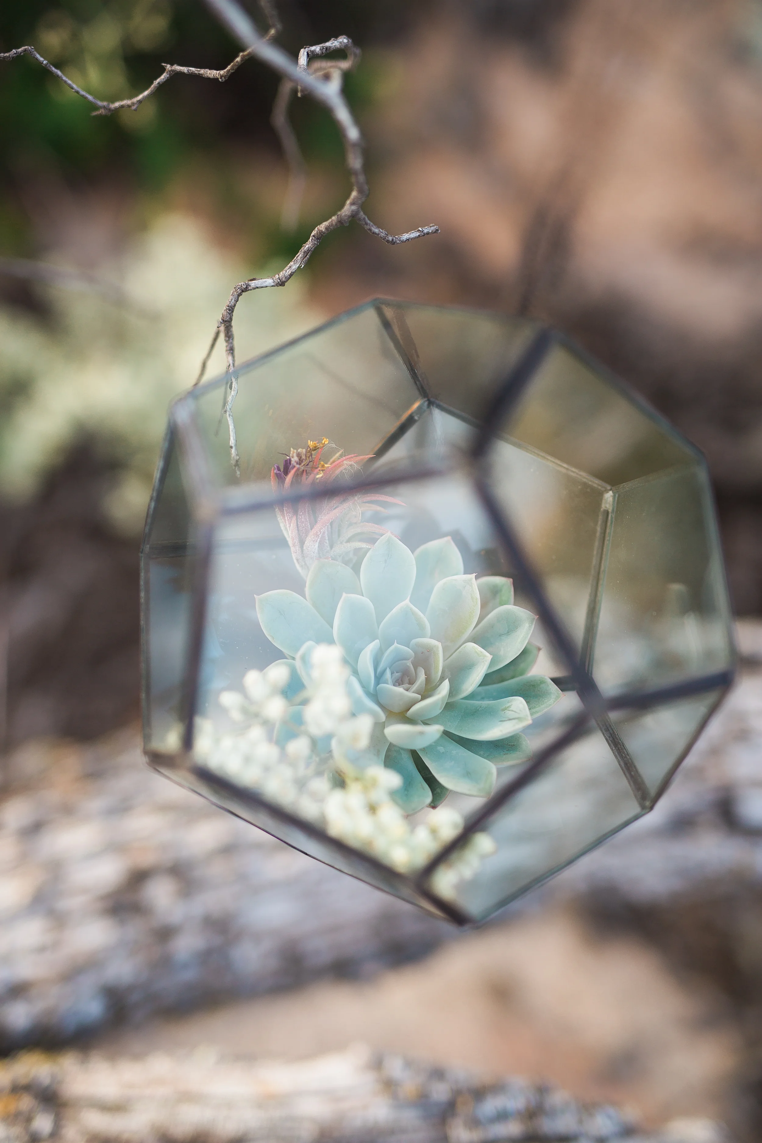 Nestled in the rolling hills of Jamul, the Bradford Ranch is a spacious venue with many different gorgeous vantage points. Our inspiration comes from the sunshine and beautiful, natural landscape of southern California. With the sun dipping lower in the sky, stunning sunbeams shine through the tree branches onto glass ornaments filled with succulents. The landscape consists of large boulders, cactus, succulents, and little yellow wildflowers.