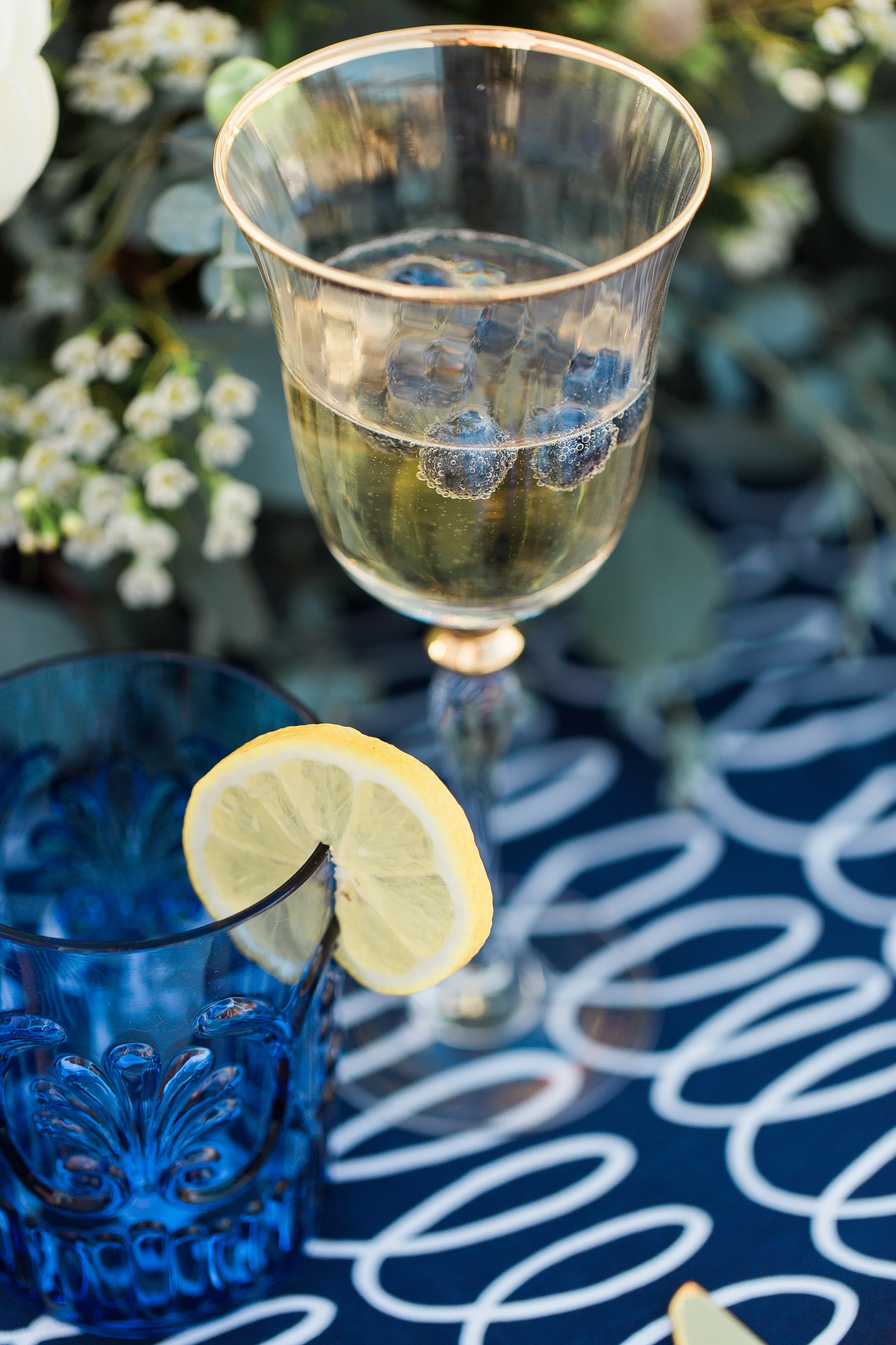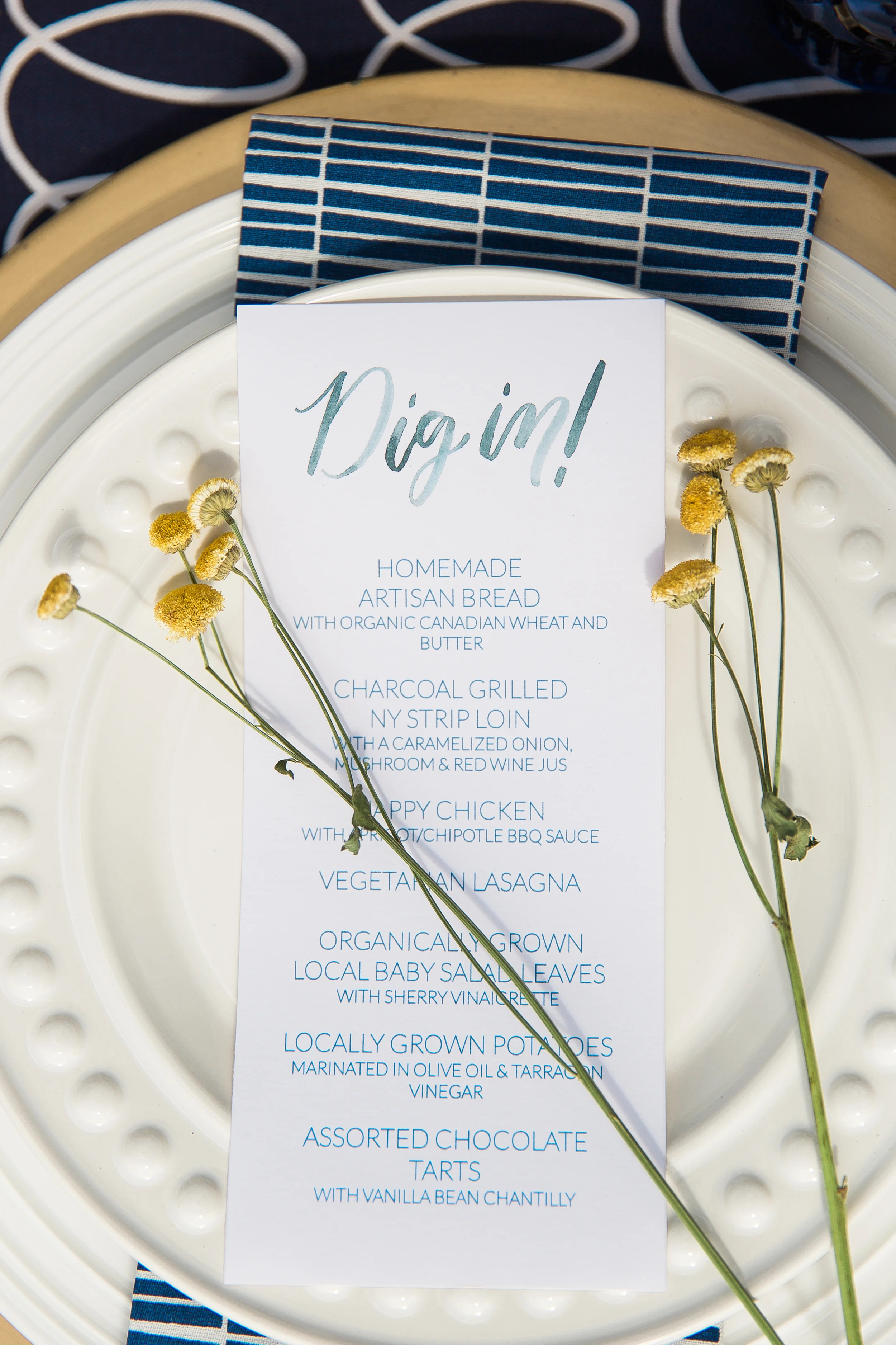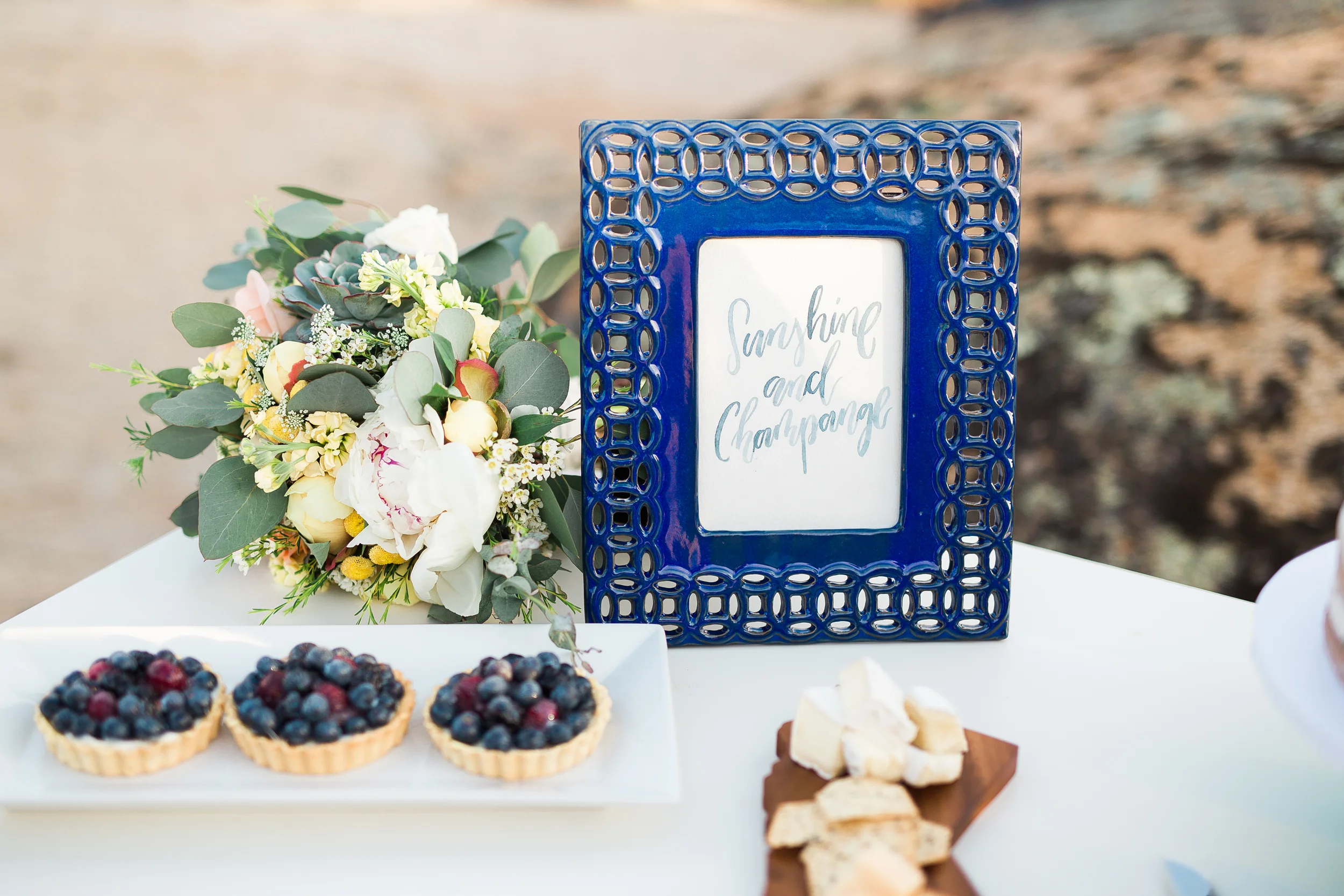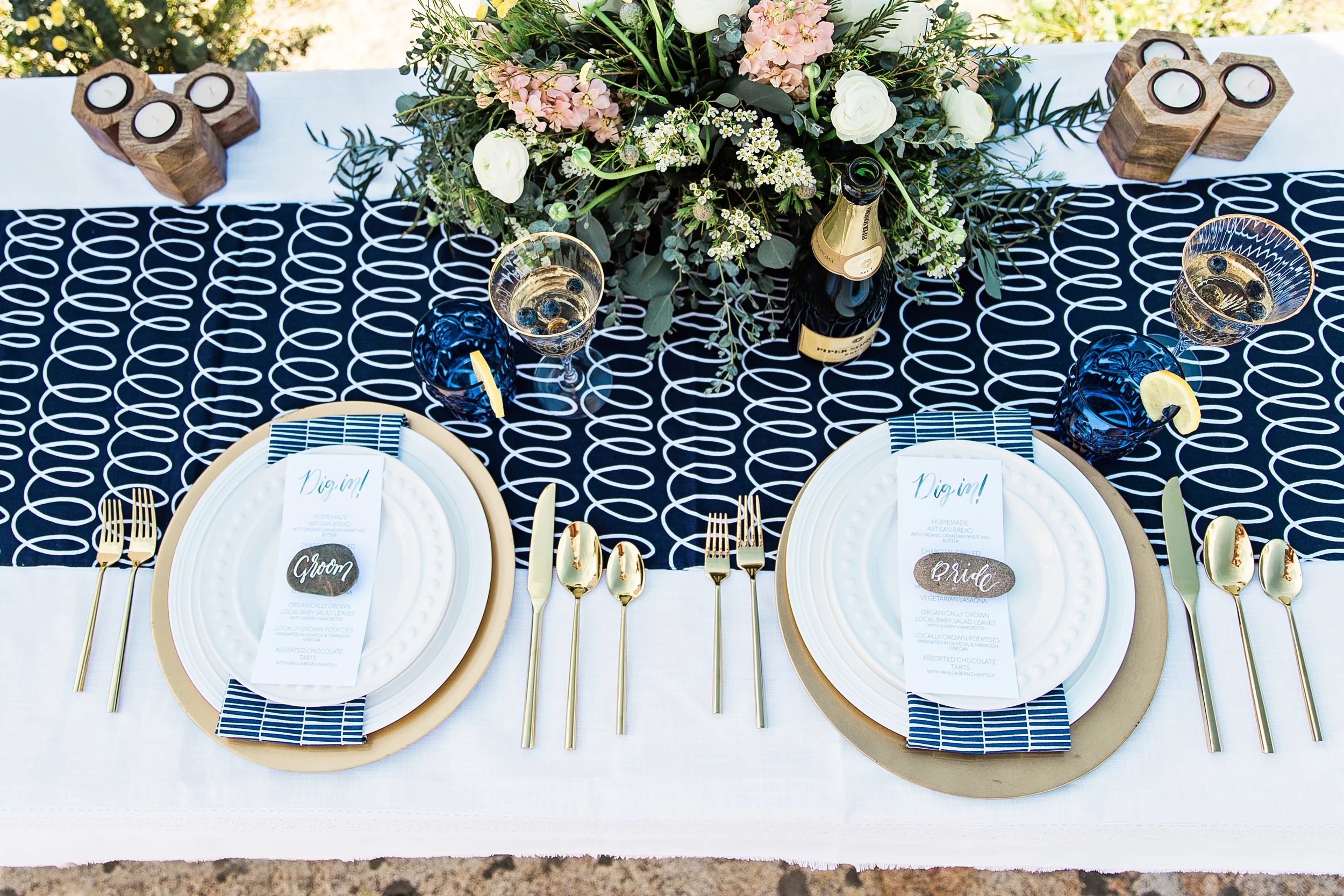 The tablescape is composed of deep blues and gold on a crisp white backdrop. The swirling pattern of the runner stands up well with the geometric pattern on the napkins, both supporting the blue watercolor calligraphy on the menu. Little hints of gold are found along the rim of the champagne glasses, the charger, and the flatware. Pulling in elements from the natural surroundings, names are written on stones, and flames dance on wooden geometric candle holders. The floral centerpiece features peonies, ranunculus, eucalyptus leaves and succulents.