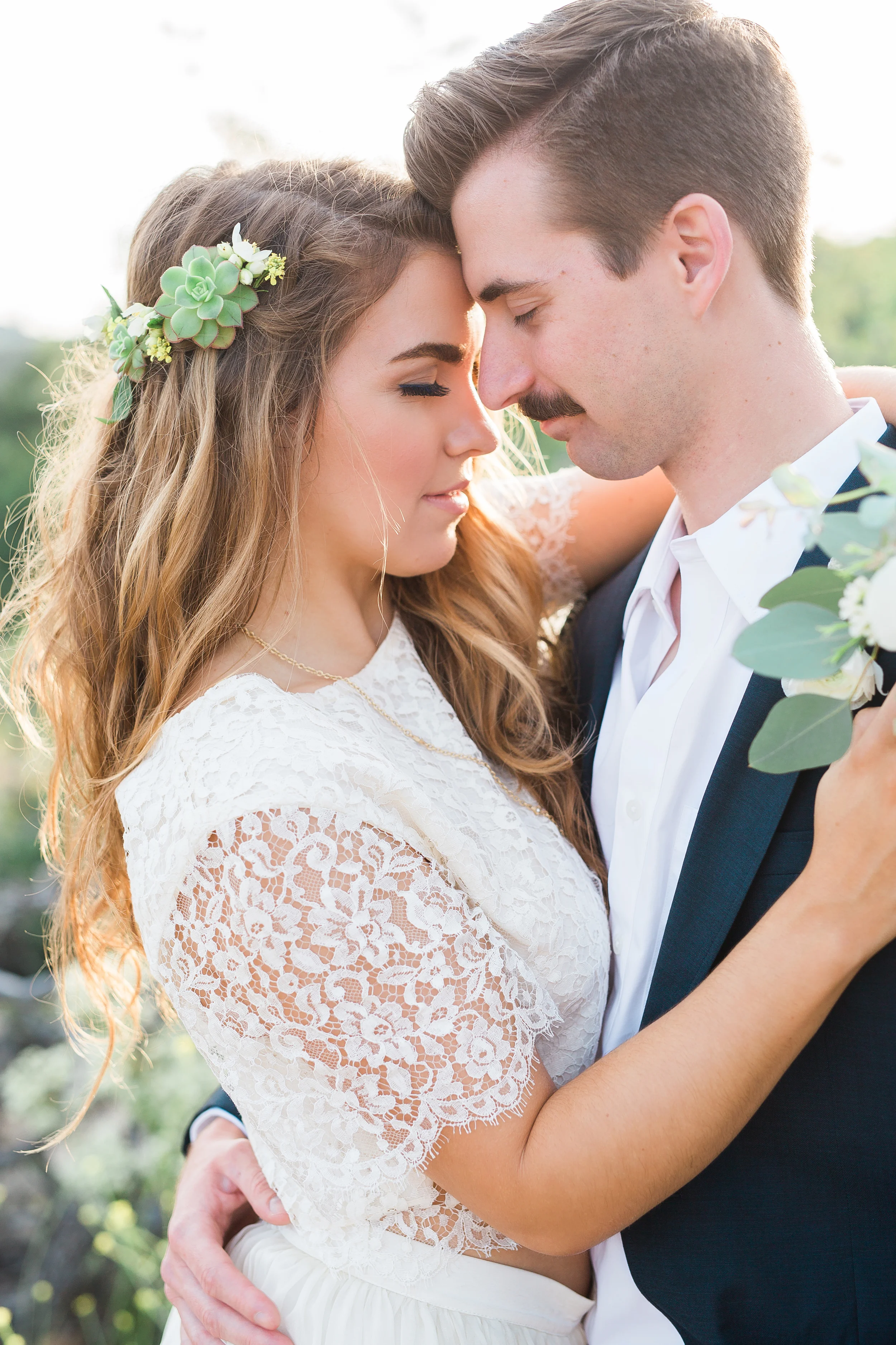 She is wearing a Sarah Seven lace cropped top paired with a flowing chiffon skirt. Her wavy hair in a waterfall braid dances around her shoulders and is dressed with succulents and yellow wildflowers. A long chain statement necklace adds a little sparkle to the ensemble. Wearing a navy blue Ted Baker suit jacket, he finishes up his look by tying the laces on polished dark brown shoes. Their look is playful and relaxed, their love radiates like the sunshine outside.