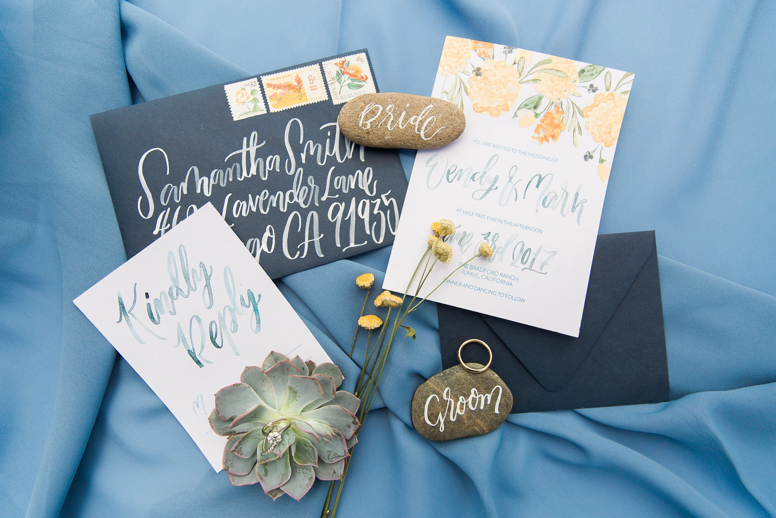 Cheerful yellow flowers on the handwritten invitations welcome the guests to an evening celebrating love in sunny Southern California. The Bride and Groom enjoy sunshine and champagne before cutting into a delicious vanilla and raspberry flavored naked cake. We are always dreaming of California love.