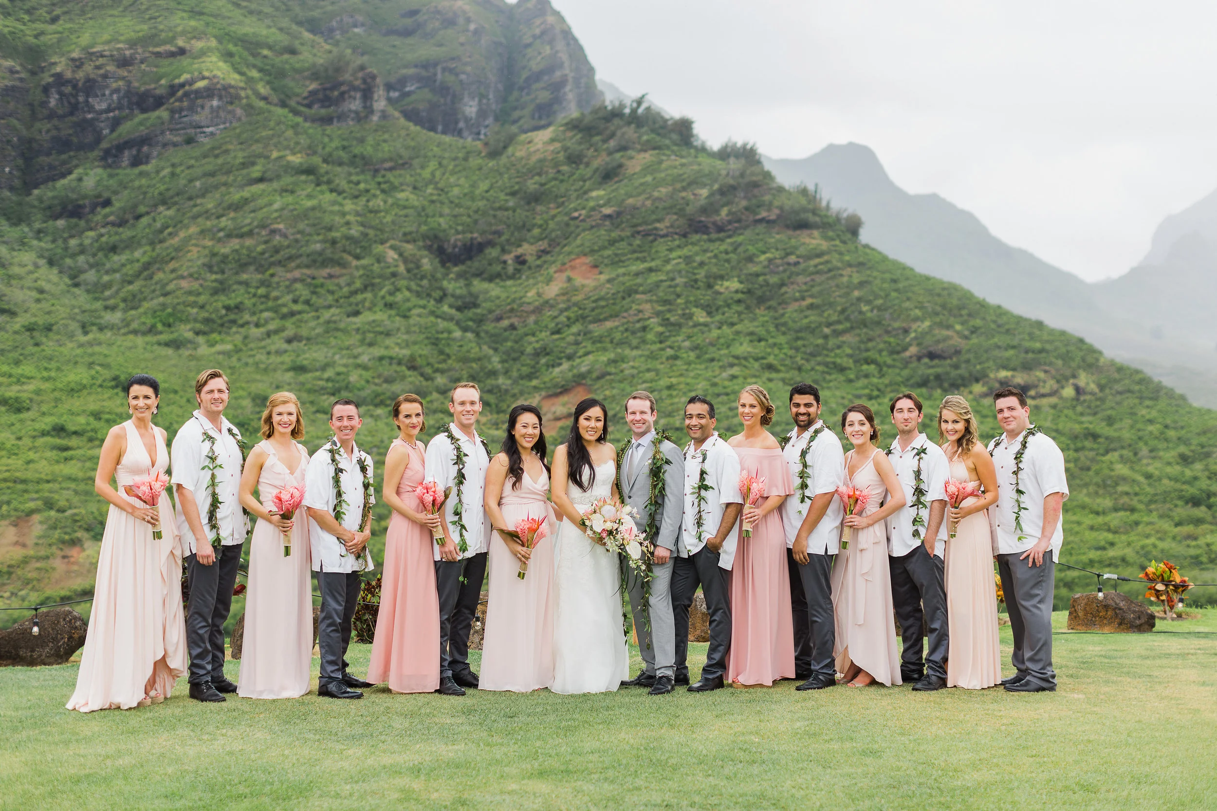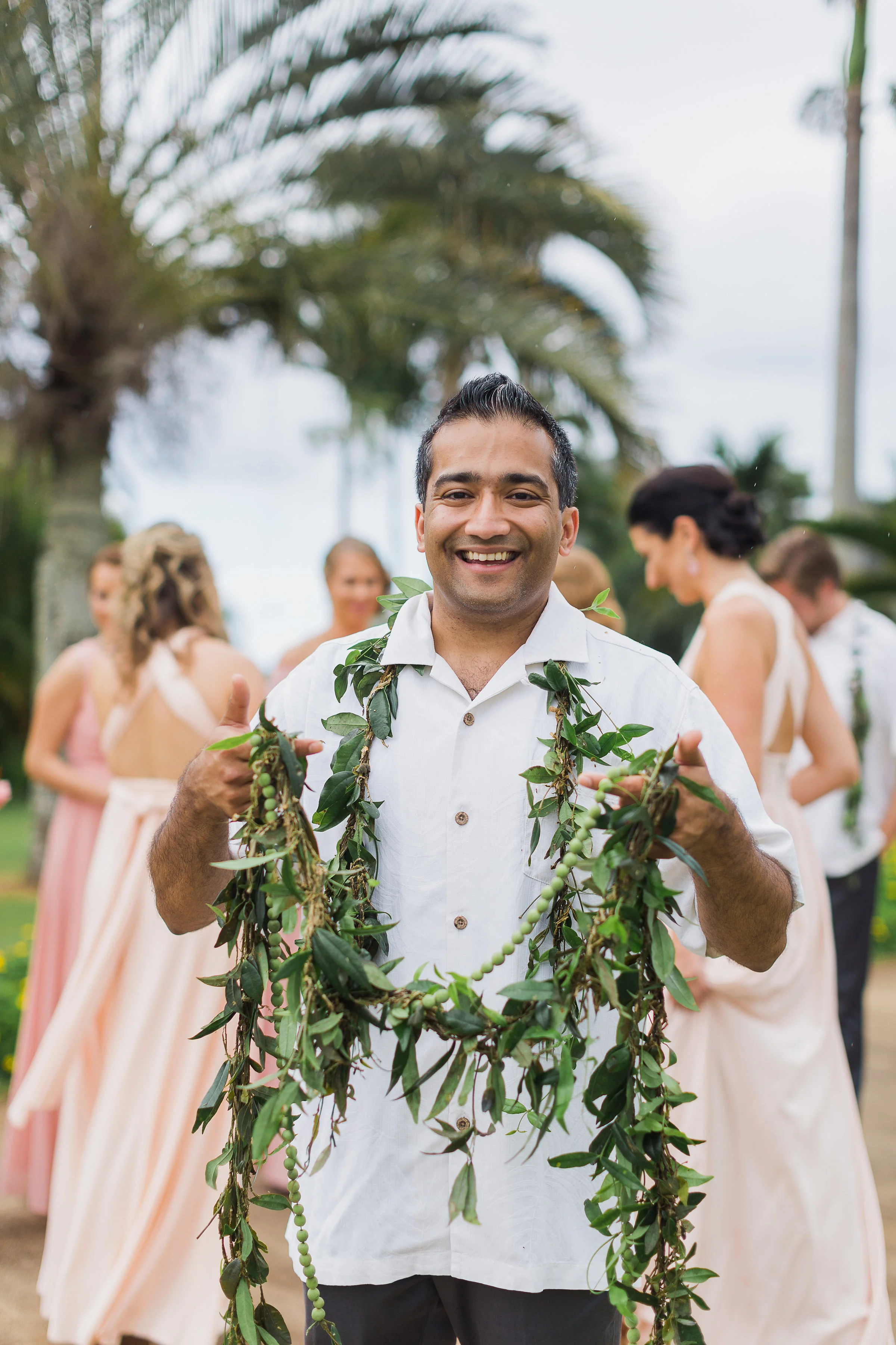 Cara and EJ looked stunning and they were all smiles! The bridesmaids wore a variety of long, flowy, blush pink dresses and their red ginger bouquets were so unique! The groomsmen looked very handsome in a white shirt, grey pants, and a Hawaiian lei made by dear friends Loke Watson and Rudy Notebo. Parents of the bride and groom also wore beautiful leis. Check out Cara's gorgeous cascading bouquet-the fabulous work of Kerri Barros!
