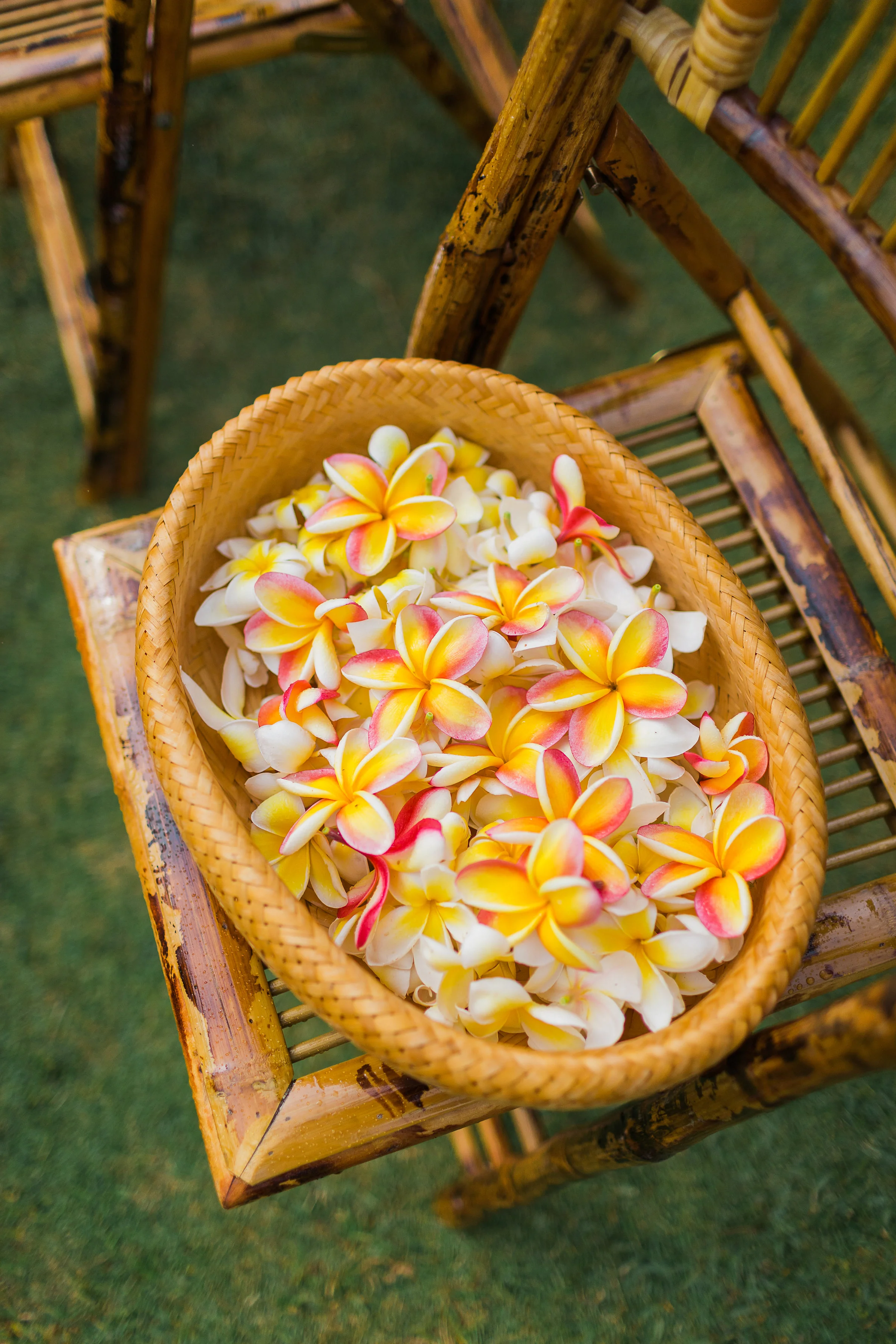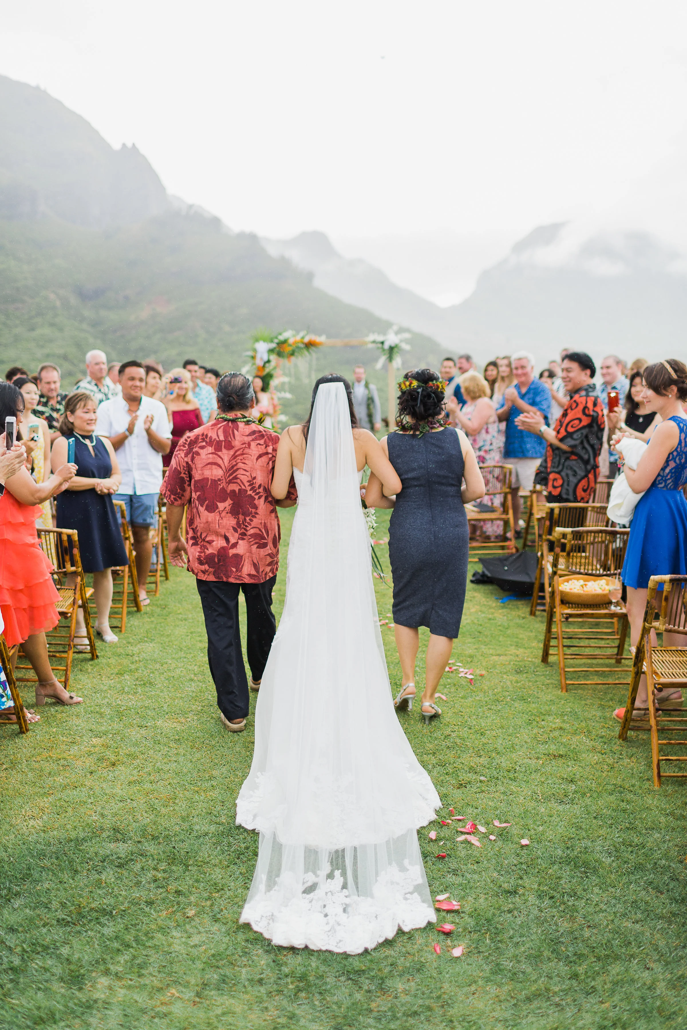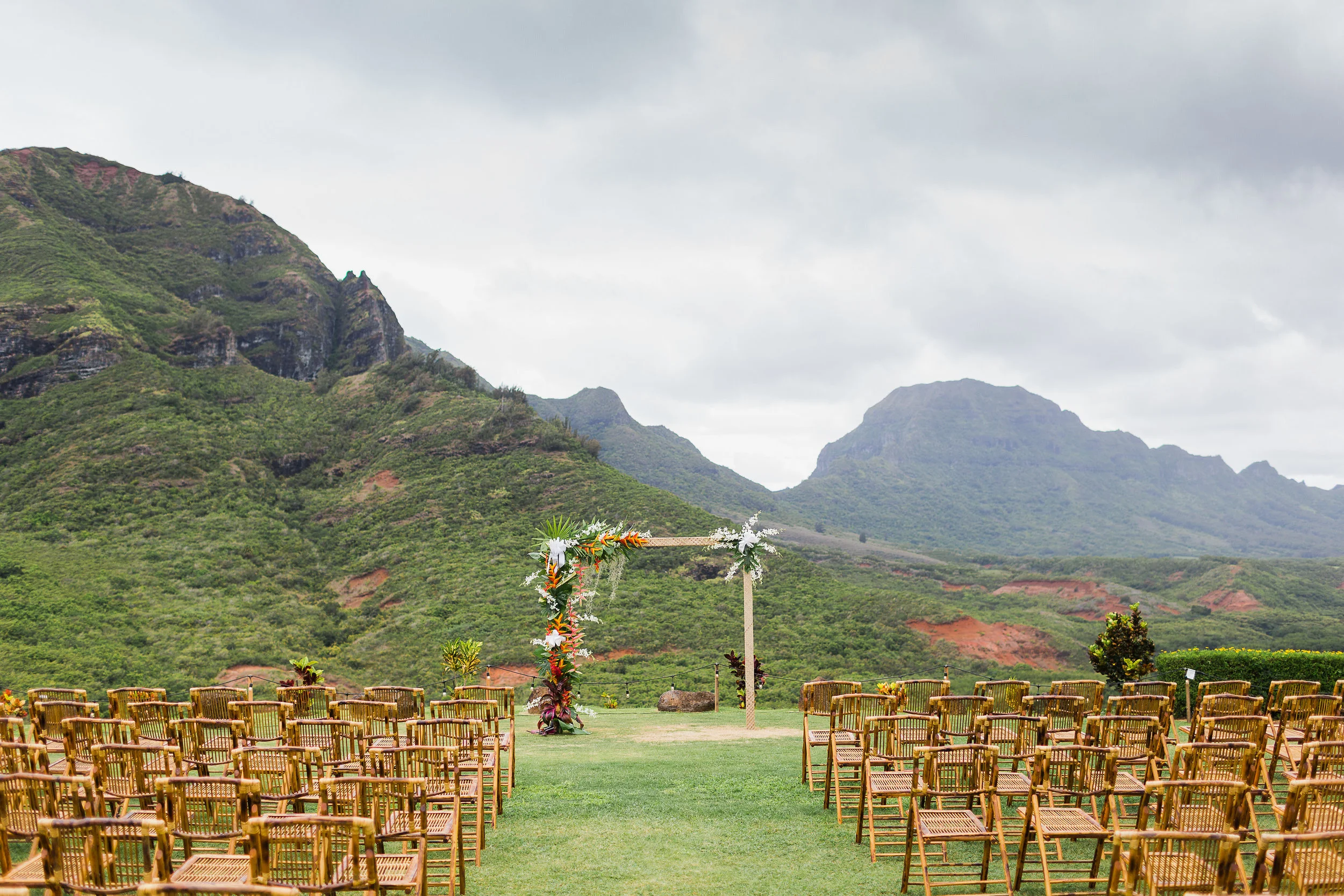 All the details and decor were ready to go as guests started to arrive. Bamboo chairs were set up in an arc around the arch, facing the gorgeous landscape. Tropical flowers and palm leaves adorned the arch and Grammy-nominated guitarist Paul Togioka played soft music to everyone's enjoyment. It's time to walk down the aisle!