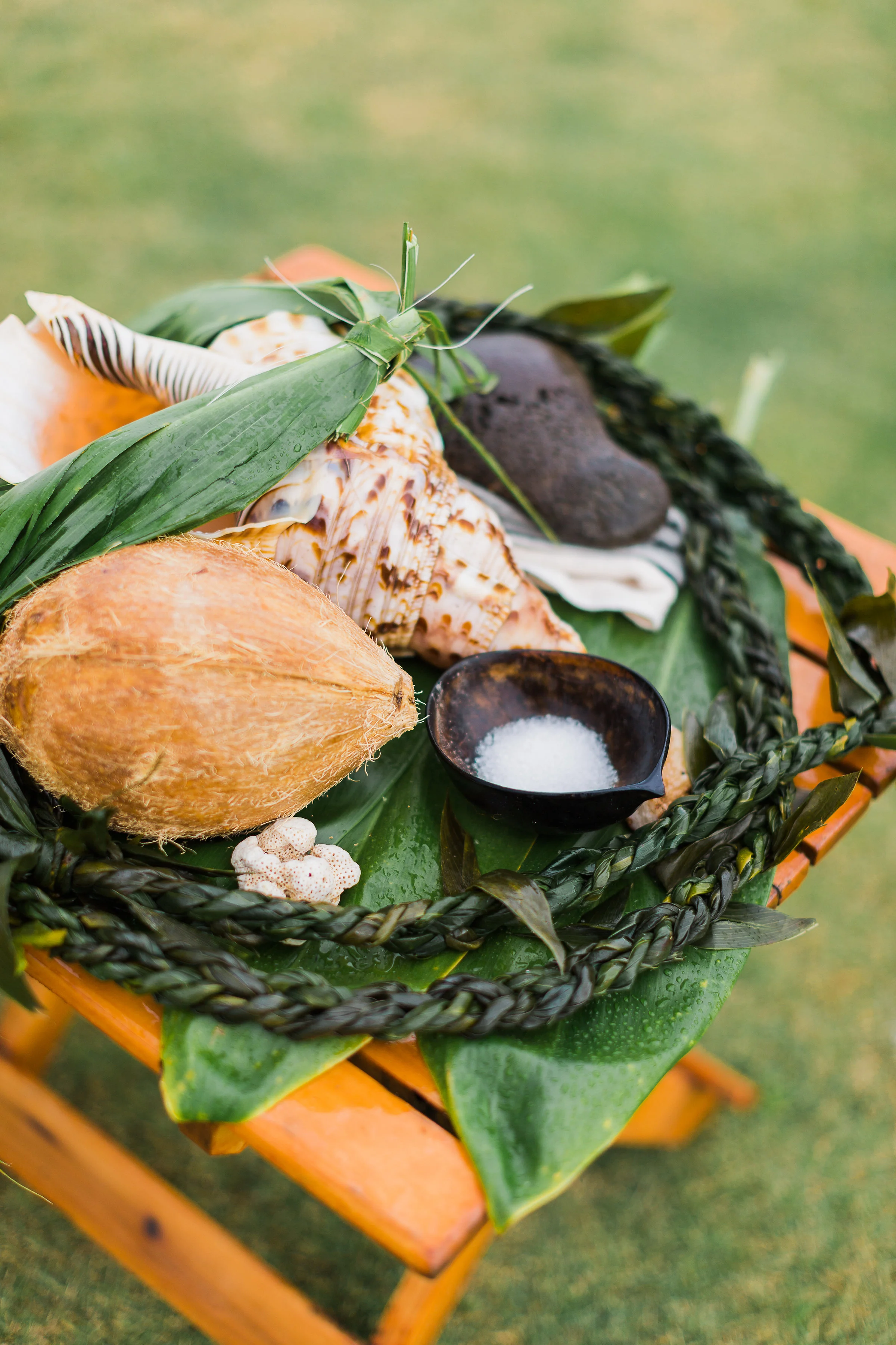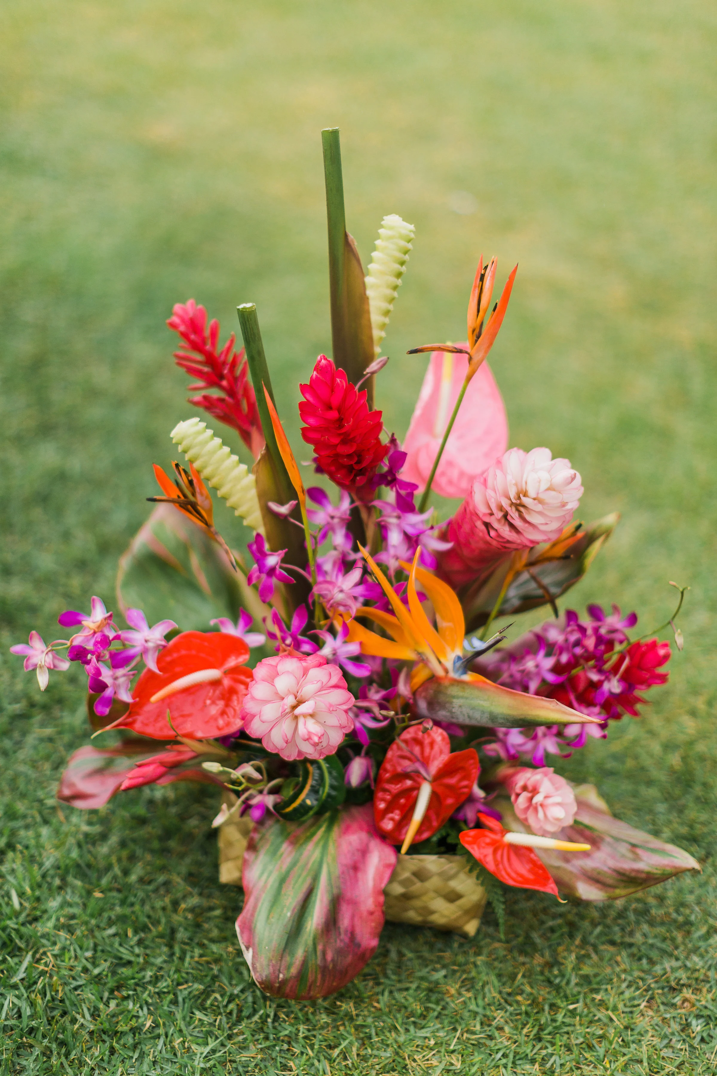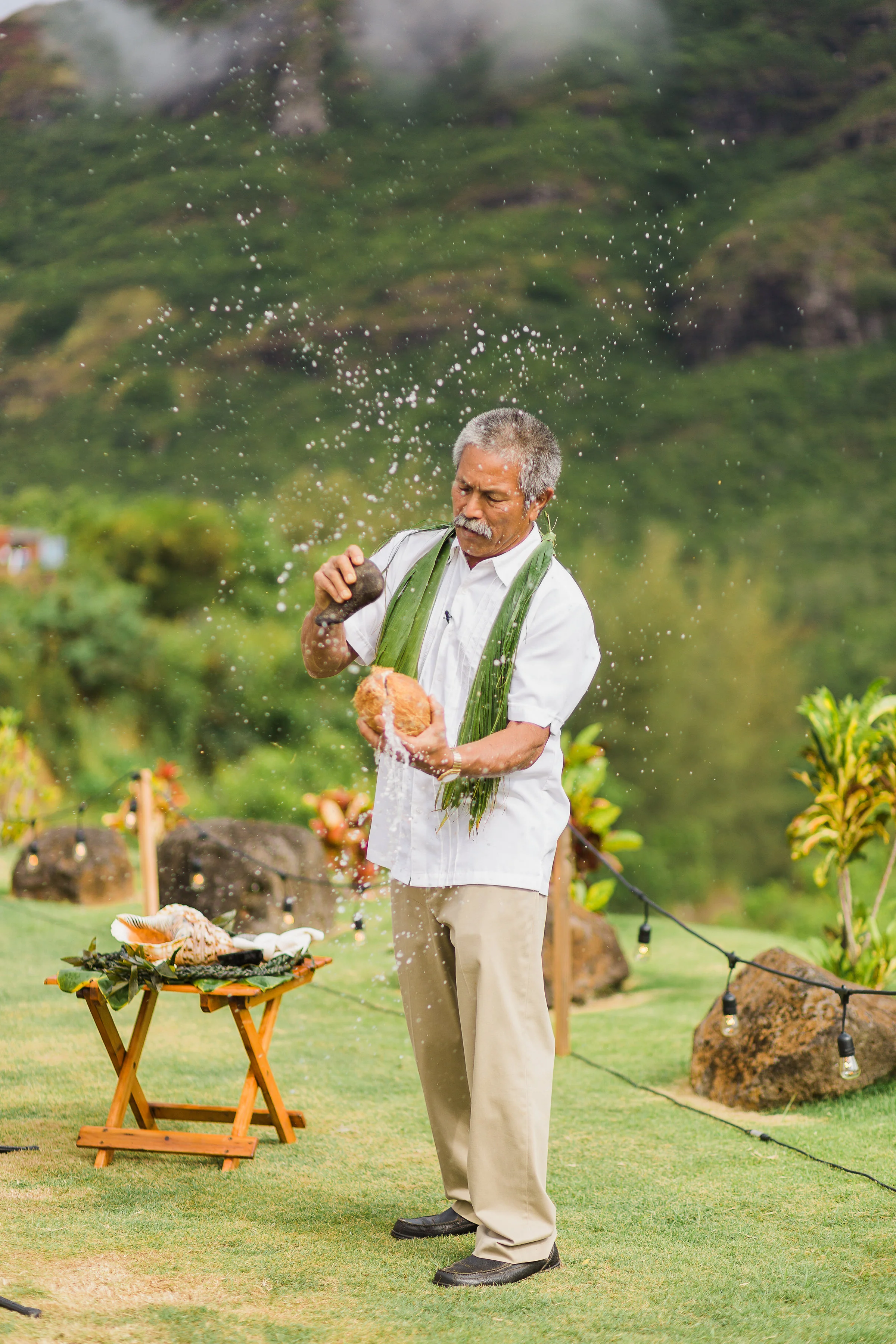 All the details and decor were ready to go as guests started to arrive. Bamboo chairs were set up in an arc around the arch, facing the gorgeous landscape. Tropical flowers and palm leaves adorned the arch and Grammy-nominated guitarist Paul Togioka played soft music to everyone's enjoyment. It's time to walk down the aisle!