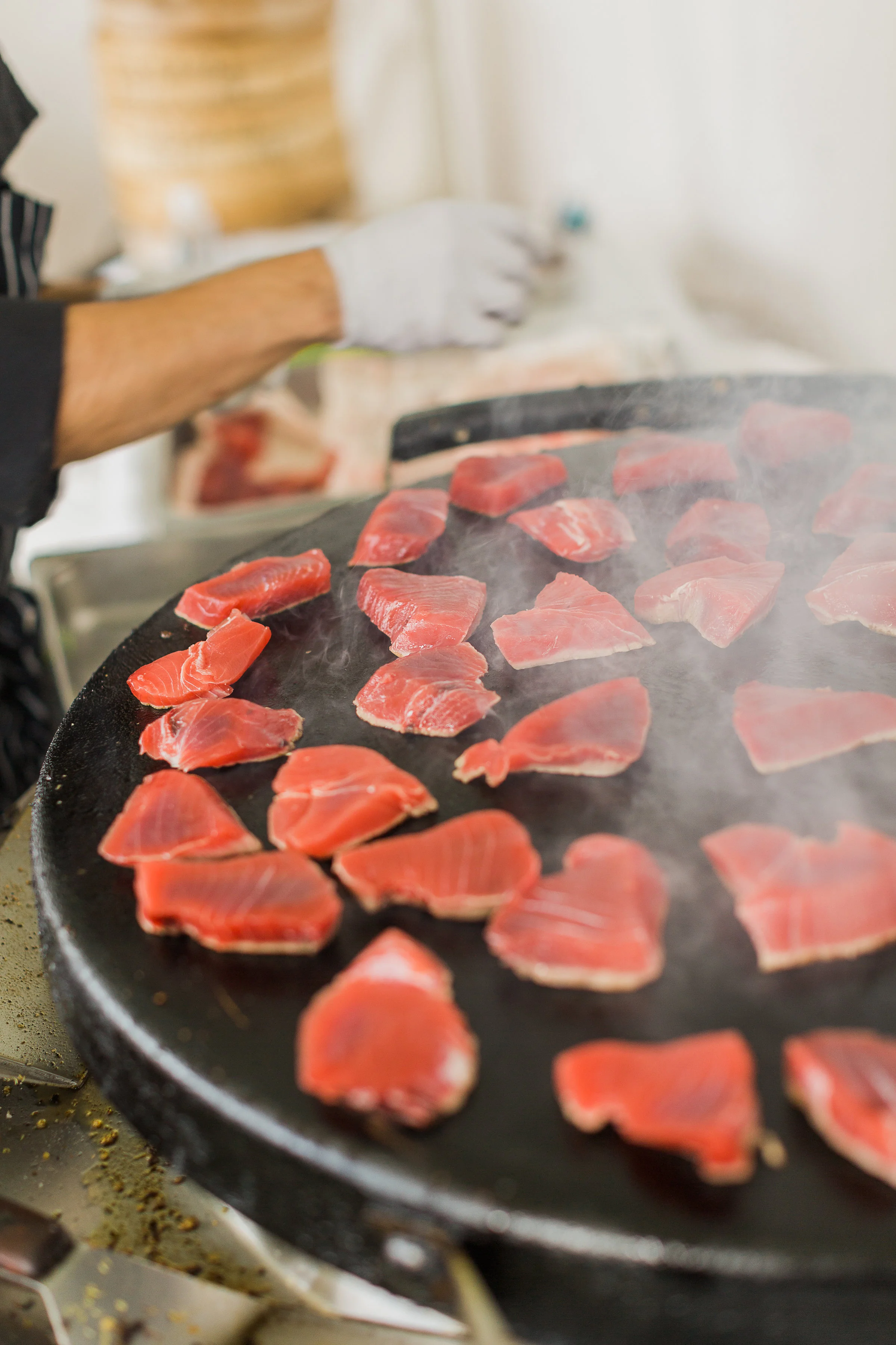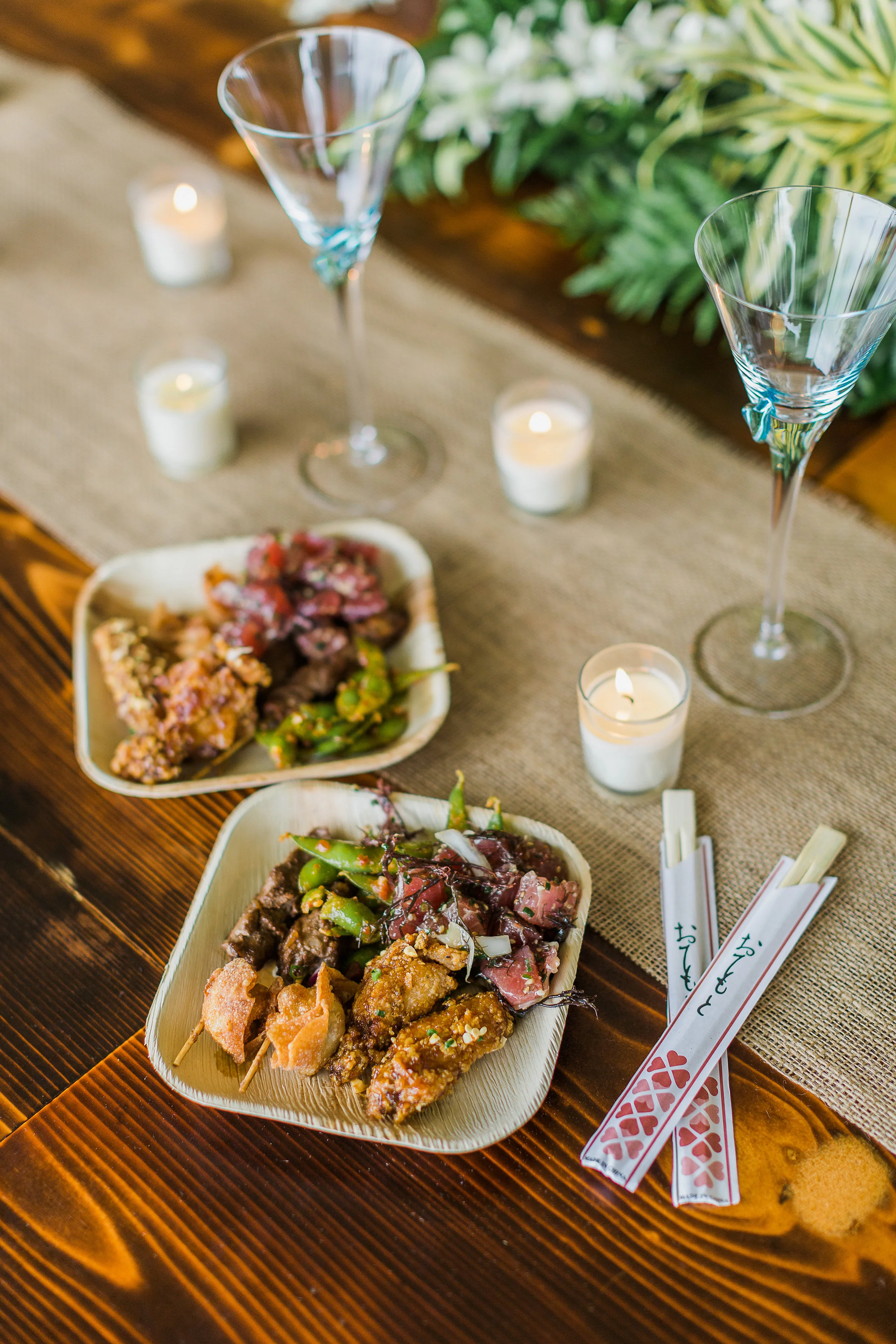 After a beautiful ceremony and heartfelt vows, Cara and EJ went to take more photos as guests enjoyed food, drinks, and good company. Contemporary Flavors Catering created amazing food displays and there was a wide variety of food stations to visit. The ahi tuna was made possible by their friend Ryan Koga who caught it only 2 days prior to the wedding!