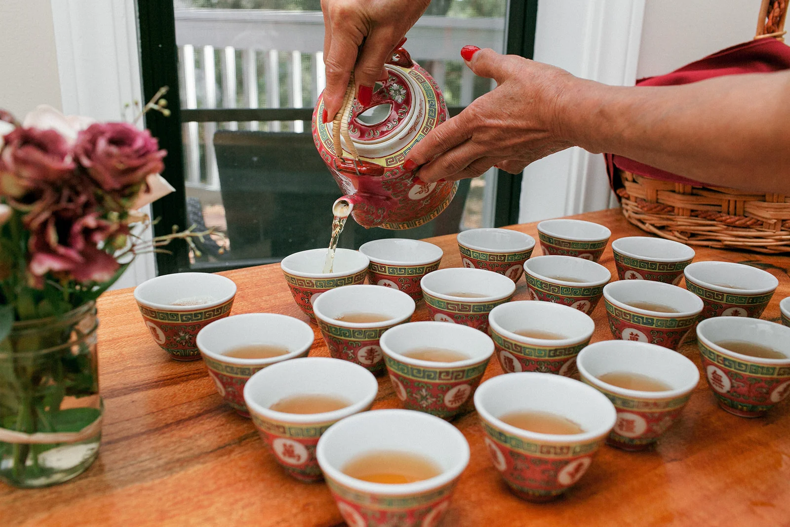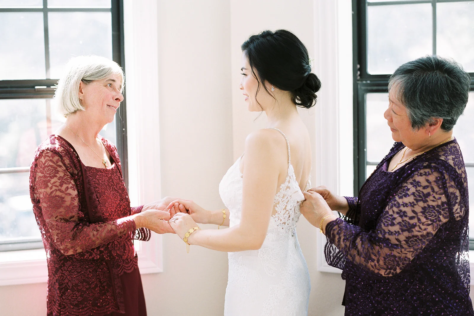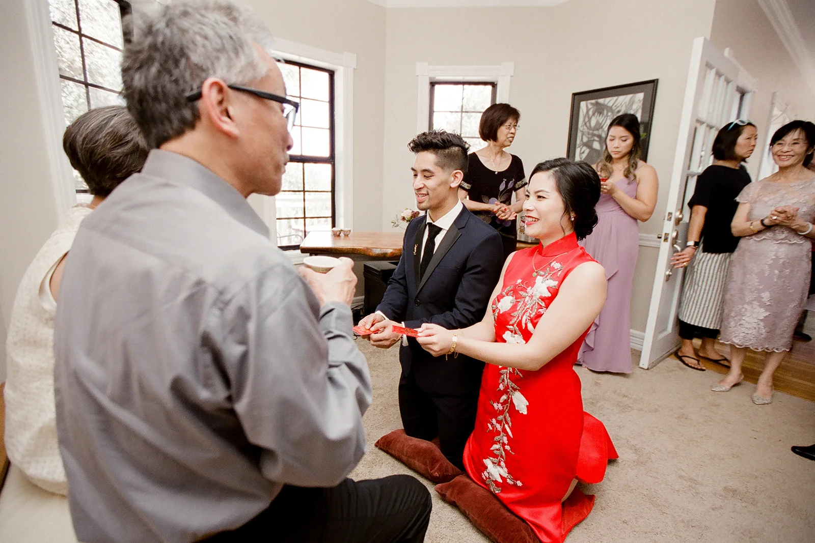 All of their best friends got ready together in the morning at an AirBnb close to the venue. It was a large and comfortable space where Randall and Lizzy were able to spend time preparing for the big day. They even hosted a tea ceremony where they served tea to the family members. Lizzy wore a traditional red qipao and gracefully served tea to parents and grandparents. They listened to the words of wisdom shared by their family members and received lucky red envelopes. After the tea ceremony, Lizzy changed into her gorgeous wedding dress and they headed to the venue.