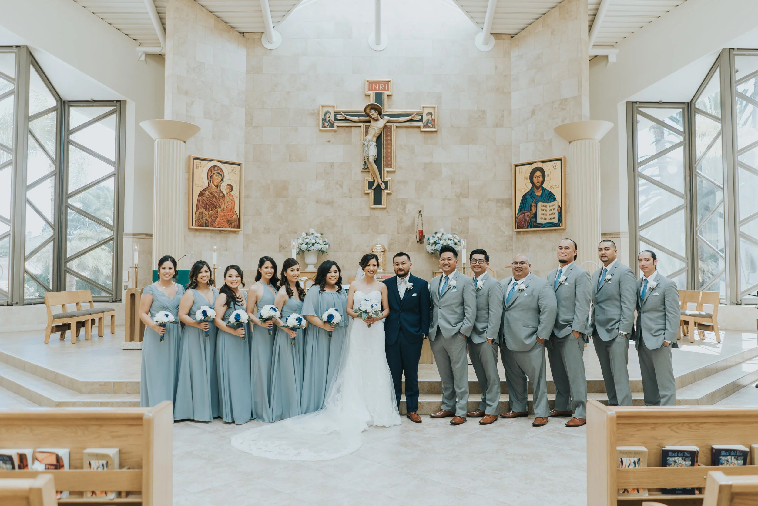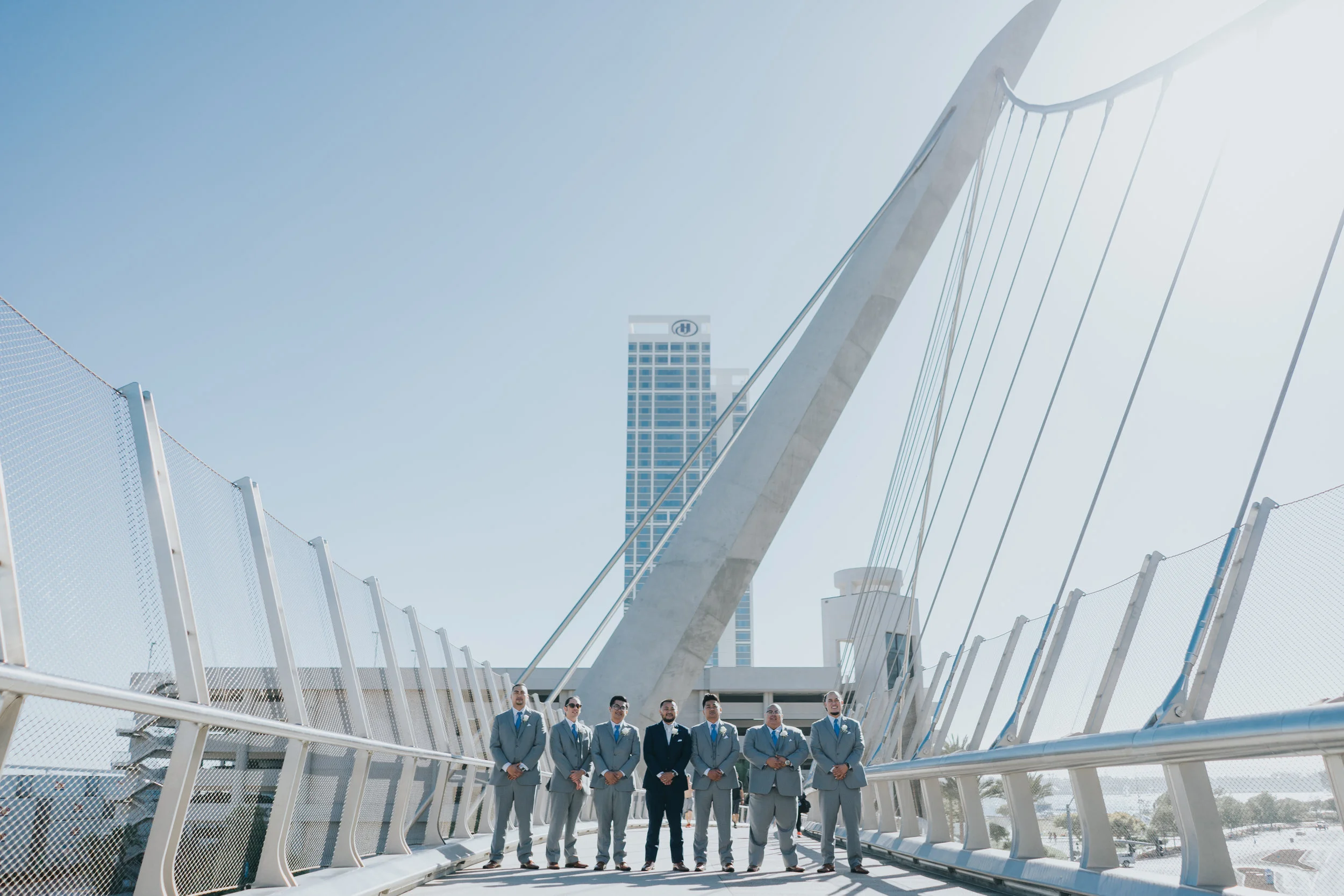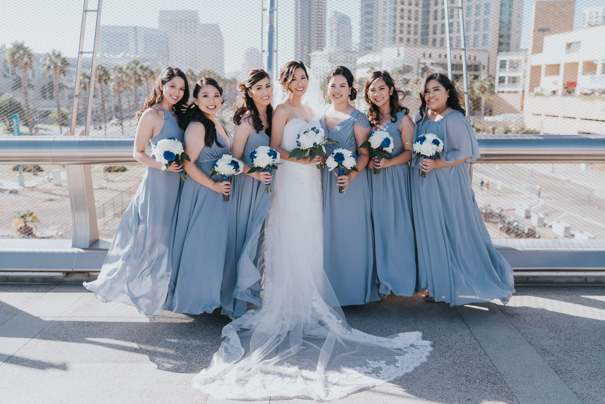 It was a beautiful, classic, sunny San Diego day that Vicem and Mary Ann got married. After the beautiful ceremony, the wedding party hopped in the Top Dog Limo and took photos near Petco Park. The ladies looked lovely in the dusty blue dresses and Mary Ann looked absolutely stunning in her dress and long, flowing veil. Vicem and his groomsmen were charming in their grey suits.