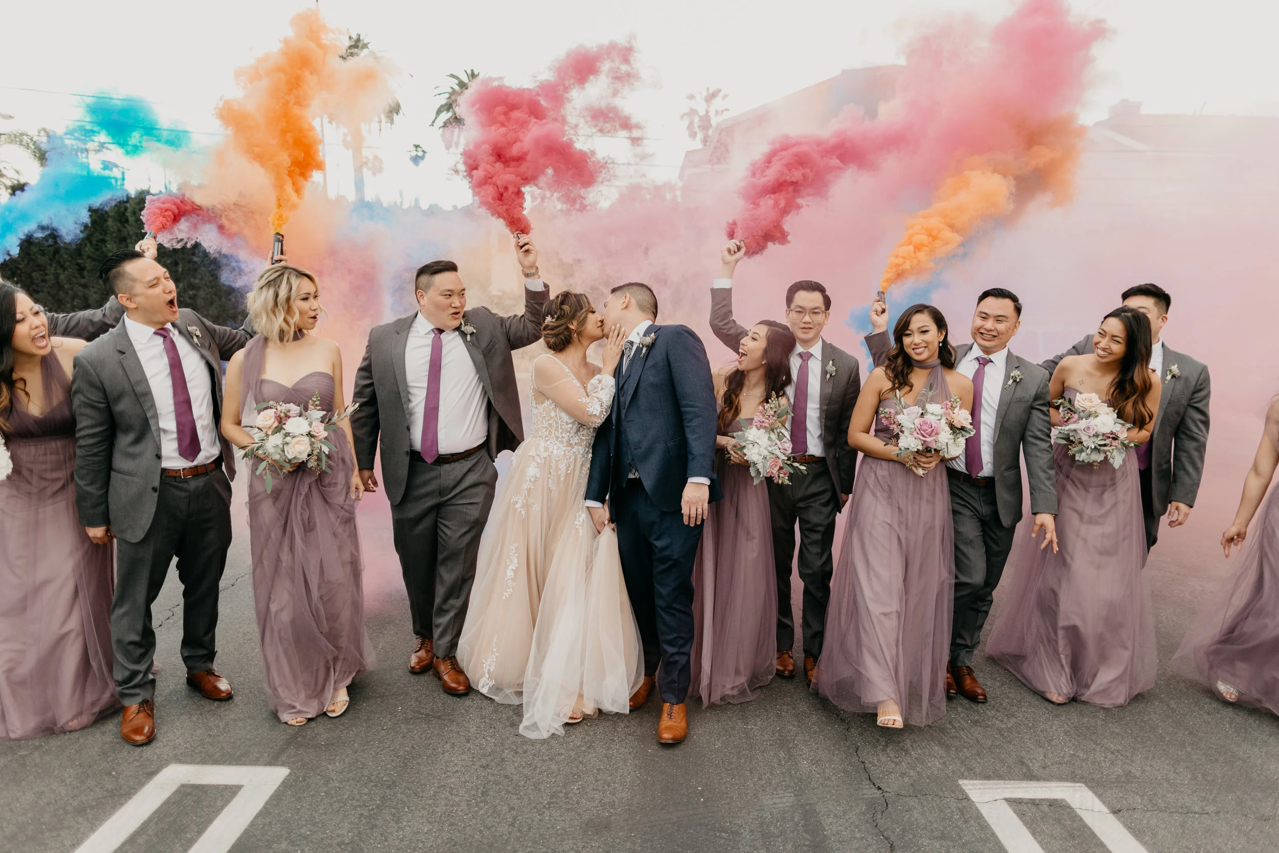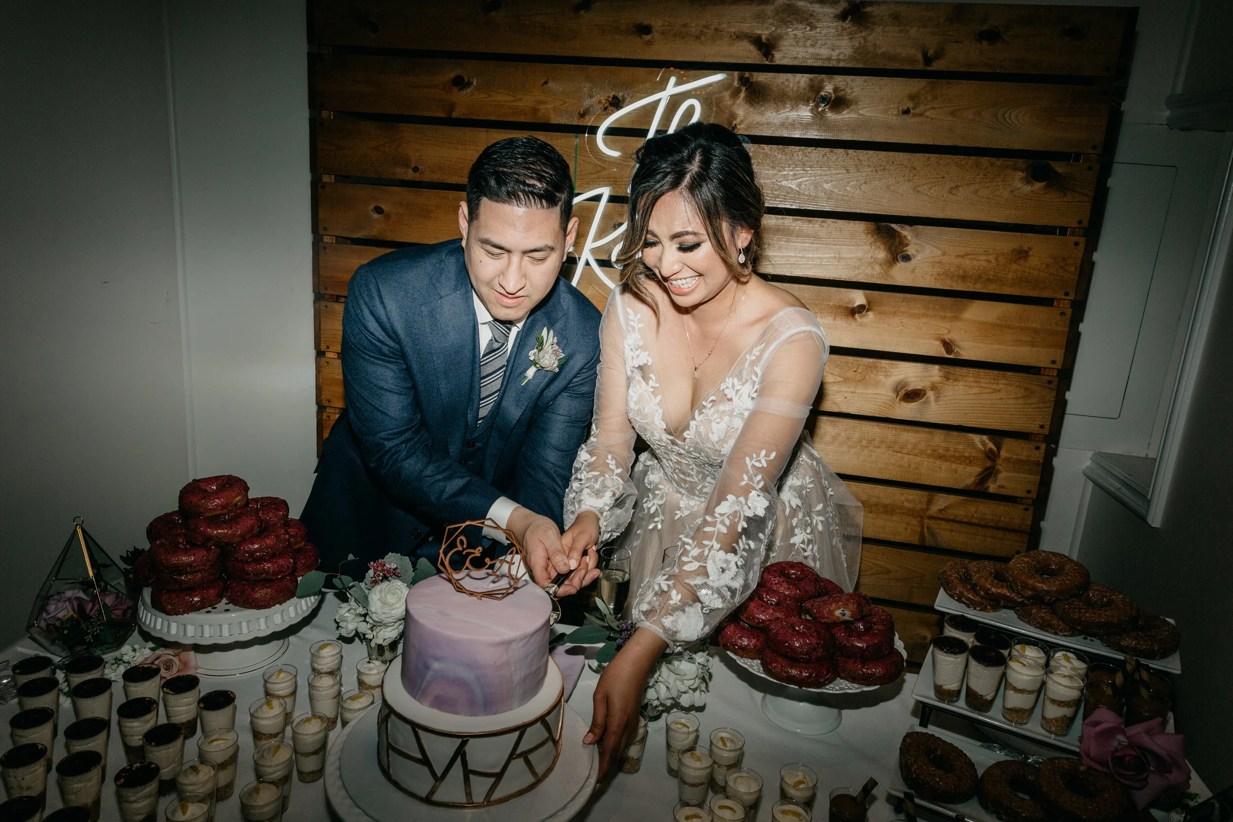 After the ceremony, the room was flipped while guests enjoyed cocktail hour outside on the patio or upstairs. The wedding party surprised everyone with a fun dance for their grand entrance! After enjoying toasts and speeches, Eula serenaded Andrew with a song while her bridesmaids backed her up by leading the guests in clapping along. The party really got started when a large piñata was brought onto the dance floor and everyone took a swing at it! The Kogi food truck came for late night munchies and it all ended on a sweet note with Sidecar Doughnuts!
